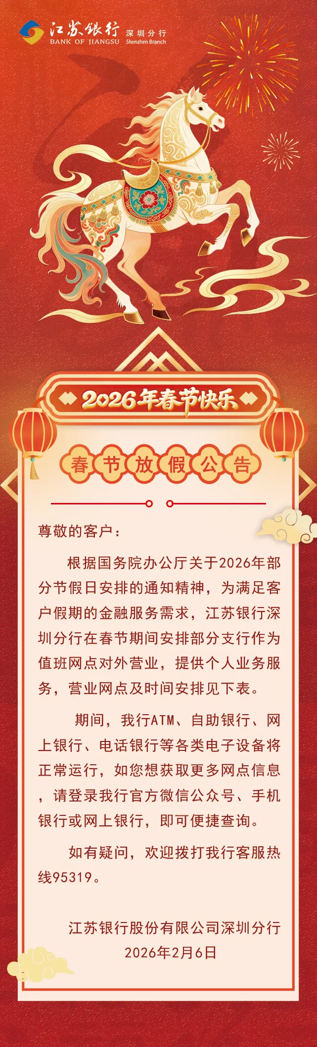 >江苏银行深圳分行 || 2026年春节期间网点营业公告