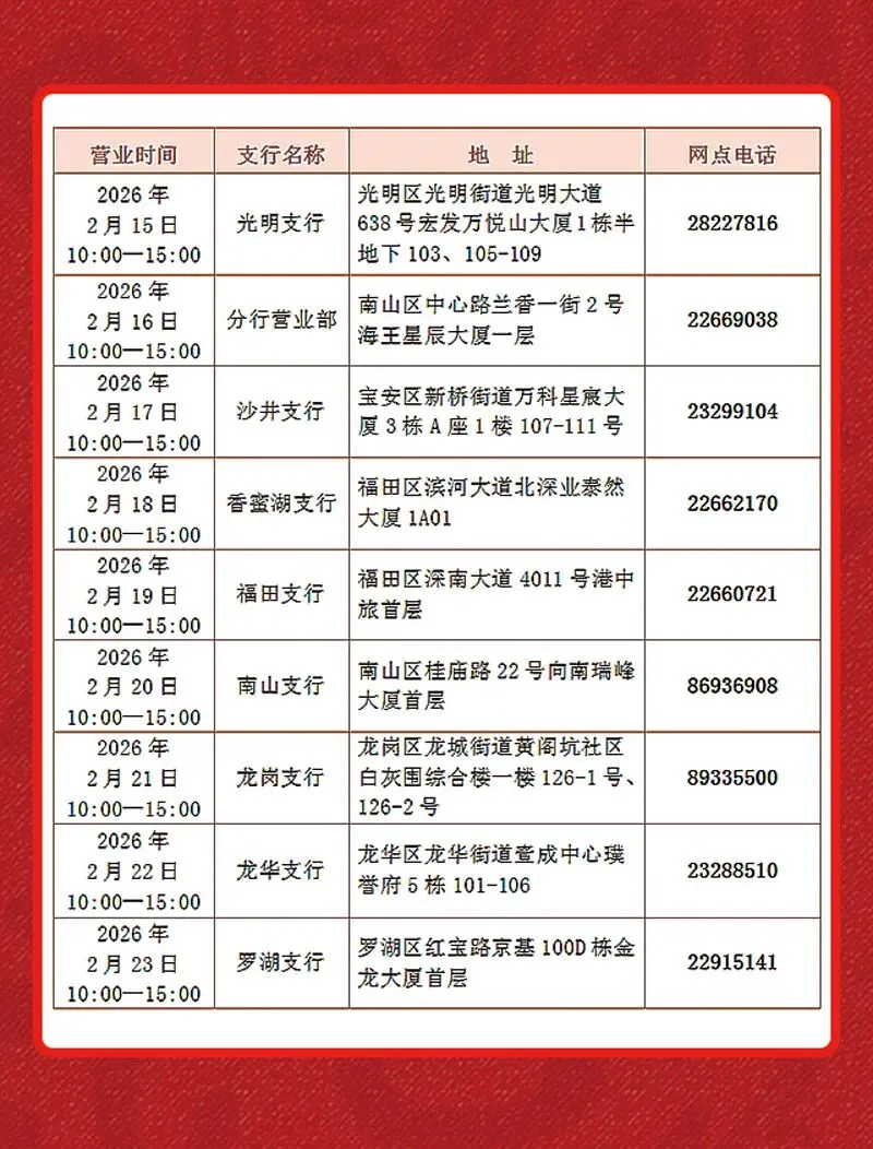 江苏银行深圳分行 || 2026年春节期间网点营业公告