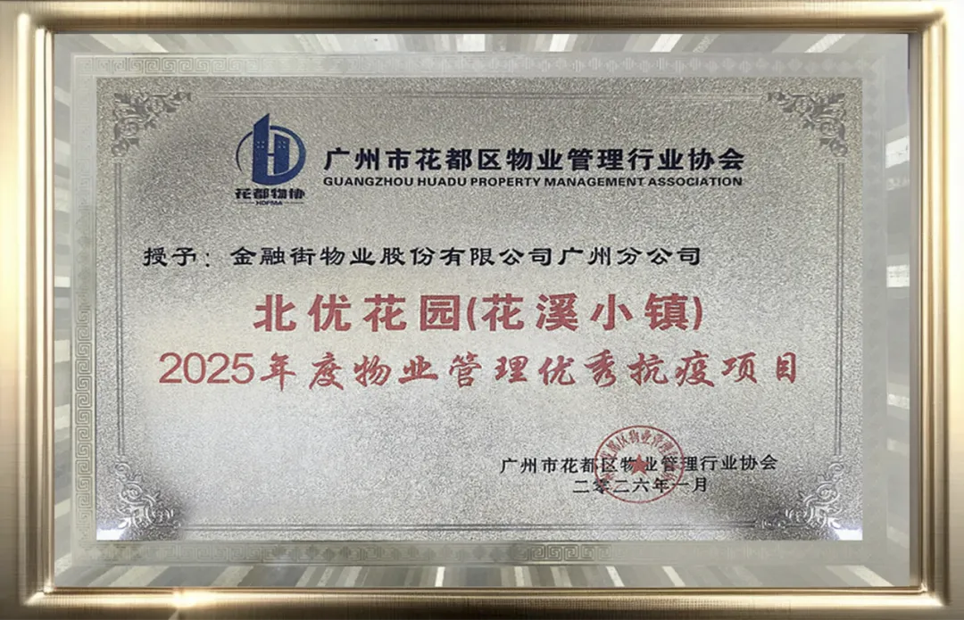 此次评选由花都区物业管理行业协会牵头,经过严格审核、实地考察、业主满意度调研及专家评审等多维度综合评定,旨在表彰在物业服务、社区治理、应急响应及人才建设等方面表现突出的企业与个人。金融街物业股份有限公司华南大区广州分公司不仅以整体实力获评“2025年度花都区优秀物业服务企业”,其管理的标杆项目——花溪小镇更被授予“2025年度物业管理优秀抗疫项目”称号,充分肯定了团队在重大公共事件中的快速响应与高效协同能力。