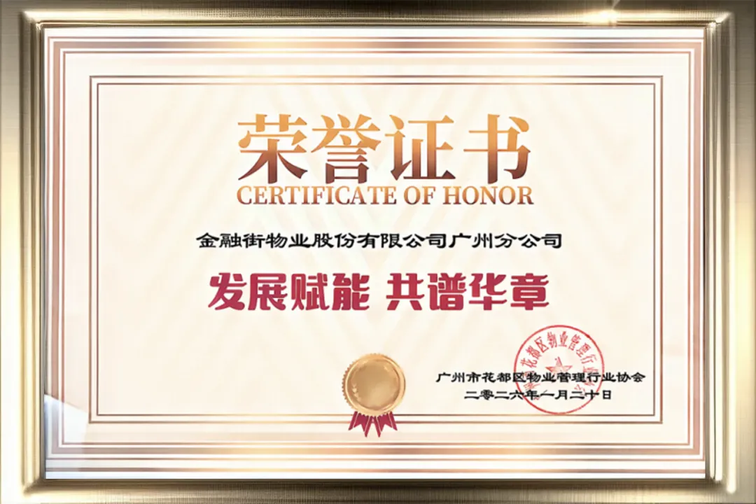这些荣誉的背后,是金融街物业股份有限公司华南大区广州分公司始终坚守“客户至上、专业为本、责任担当”的服务理念,是数百名员工日复一日在秩序维护、设施运维、环境保洁、客户服务等岗位上的默默付出,更是公司持续推进精细化管理、数字化转型与人文关怀体系建设的成果体现。