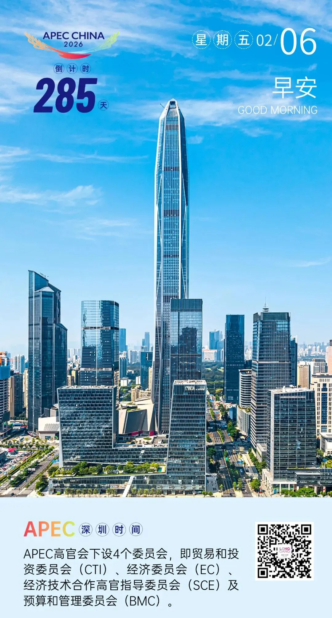 2026年亚太经合组织(APEC)领导人非正式会议,将于11月18日至19日在深圳举行,各方亚太伙伴将相约深圳,谱写更加精彩的亚太合作新篇章。龙岗融媒特别推出《APEC深圳时间》专栏,通过一张张精美倒计时海报,与你一同见证APEC盛会的到来!