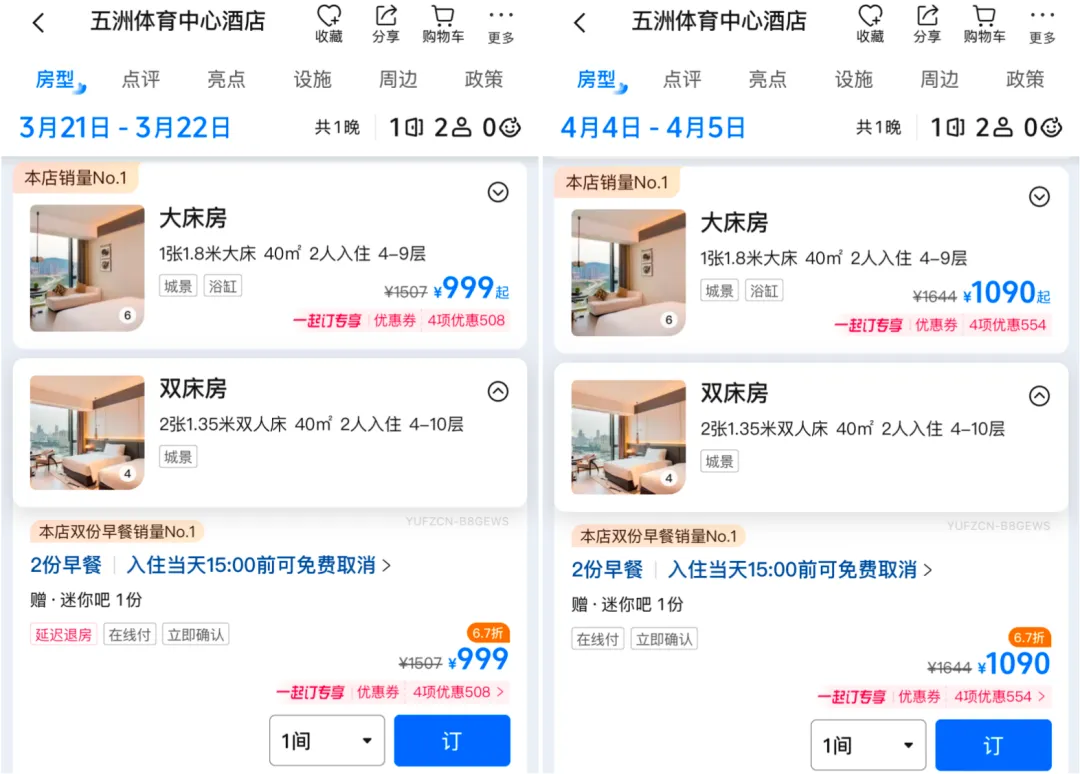 如果不需要早餐的话,1099/两晚可拆分+视房态延迟退房至14点,单晚不到550元住福田市中心五星级酒店,性价比很高。