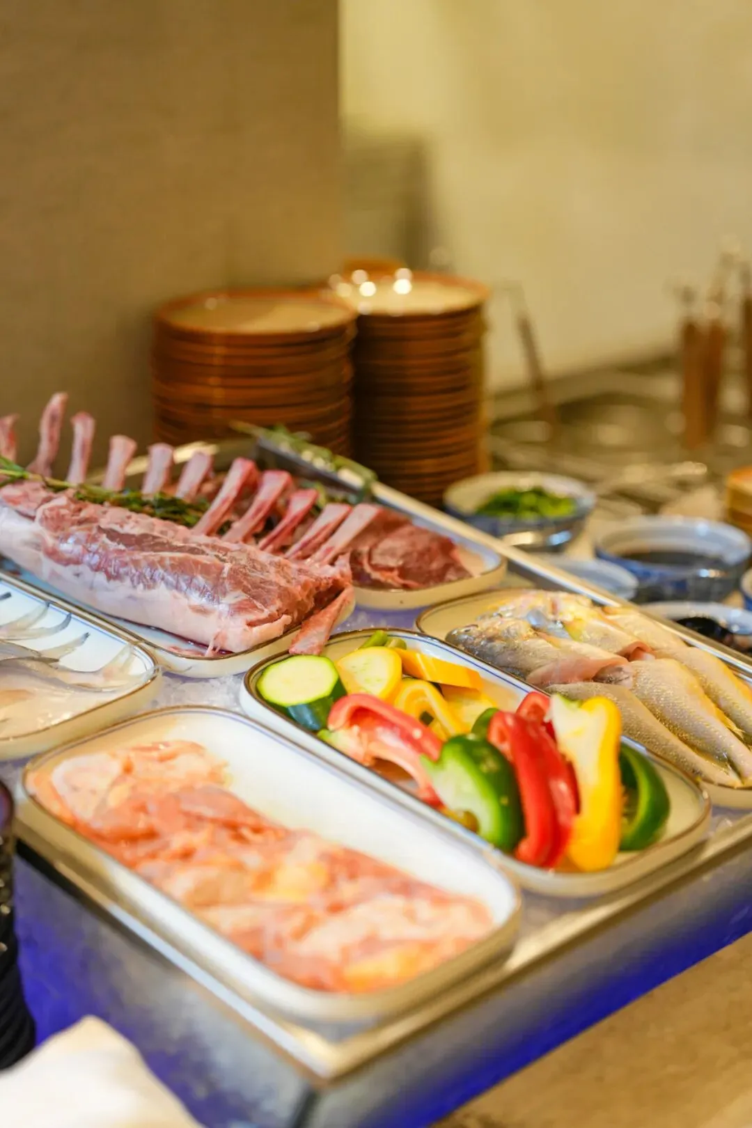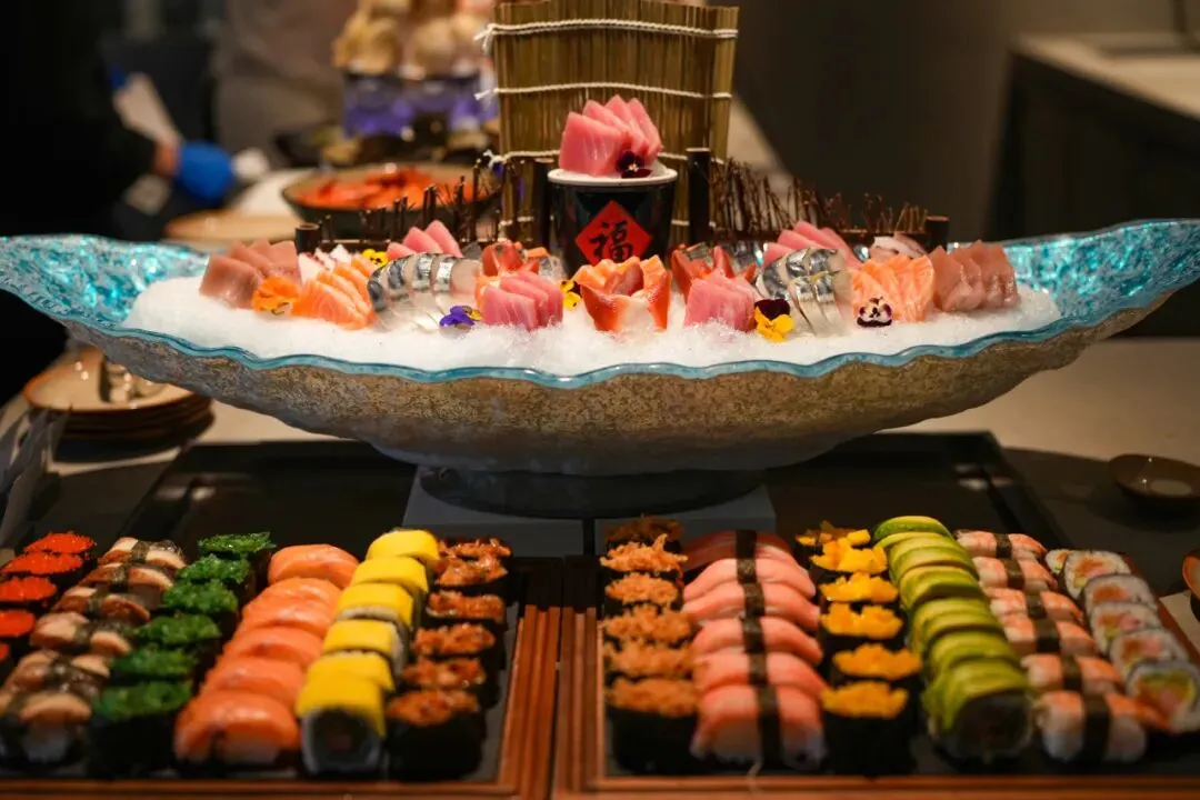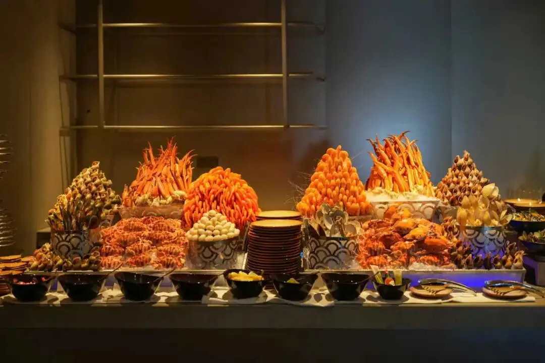 他家的自助晚餐很硬核,不仅有多种冰镇海鲜,刺身档口的三文鱼、金枪鱼等也都是新鲜厚切,诚意十足。还有明档现场切制的潮汕鲜切牛肉,像三花趾、吊龙等部位无限量畅吃,肉食者友好。