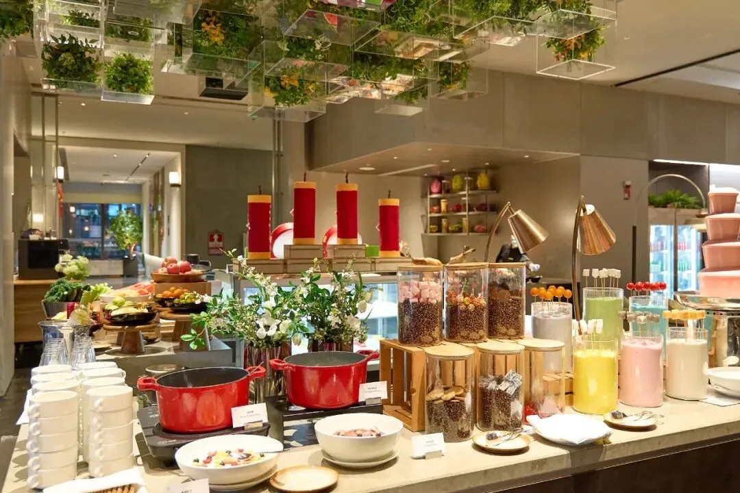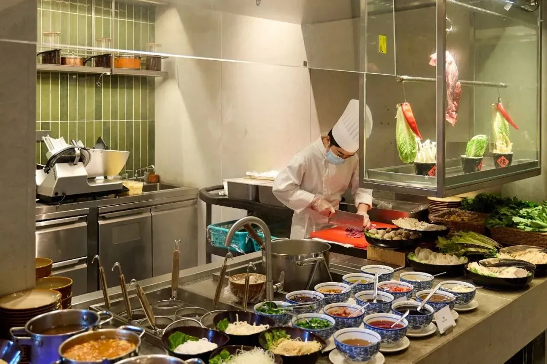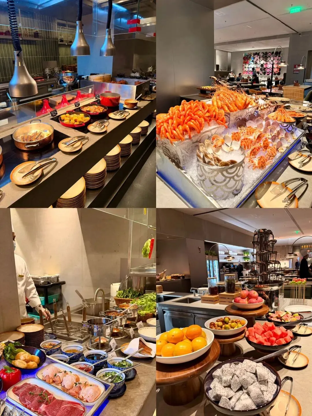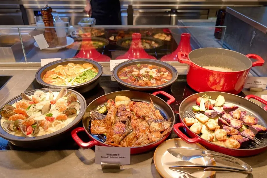 餐厅提供轮换的中西热食,从广府经典到川湘香辣,选择丰富。现场还有巧克力喷泉、精致甜点和多种水果、冰淇淋自助,晚餐时段有很多周边居民在这用餐。