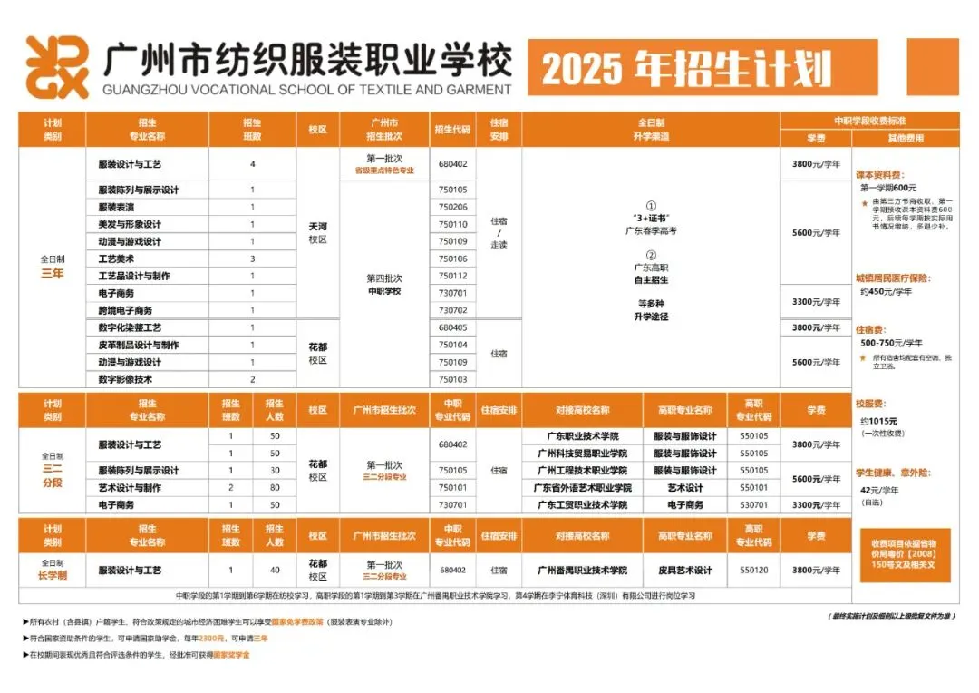 ·学校概况:学校创办于1958年,是广州市教育局直属公办中职学校,获评国家级重点中职校、省示范性中职校及省高水平中职校建设单位。现有天河、花都两大校区,开设时尚产业、艺术创意等四大类16个专业,服装设计与工艺为省重点建设专业,牵头成立广州时尚艺术设计职业教育集团,是2010广州亚运会火炬传递服装设计中标单位。