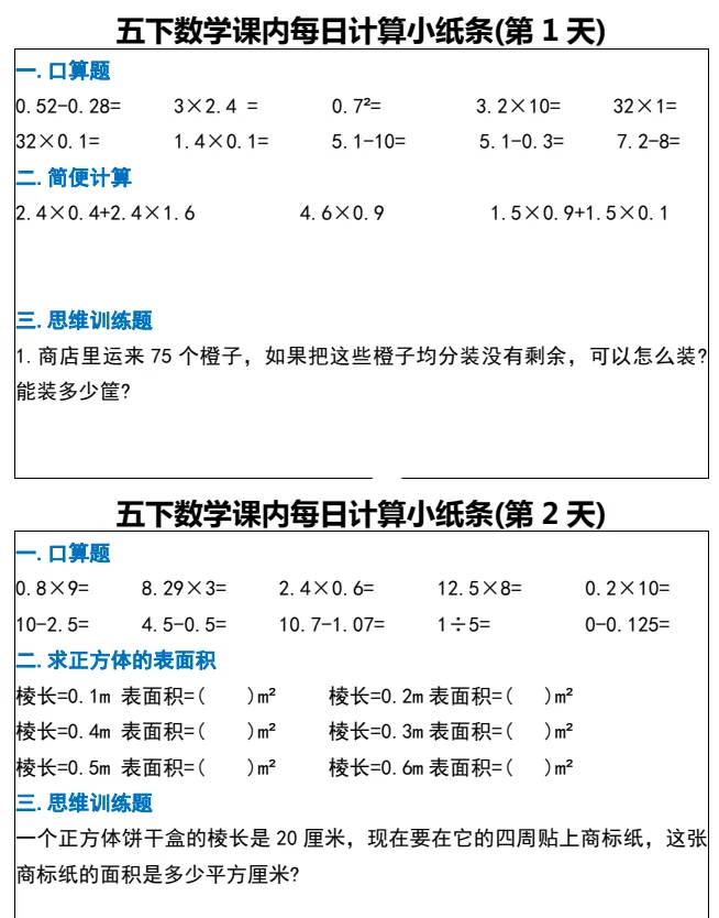 📌 温馨提示:本资料为配套课堂使用的校本计算训练,与人教版五年级下册教材完全同步,无超纲内容。