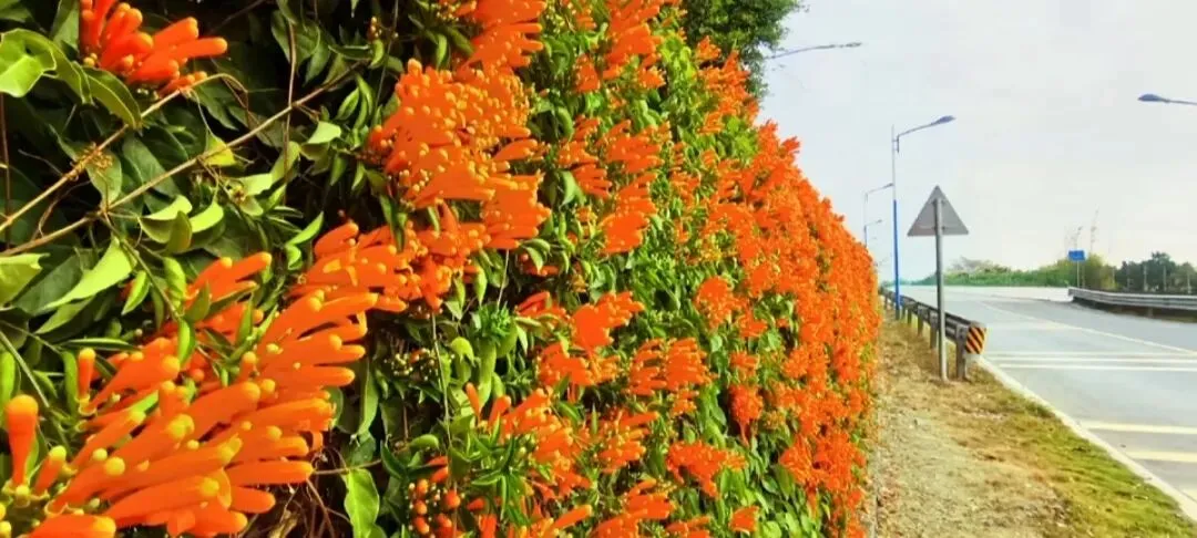 开车上岛是不错选择,不用过观龙岛大桥,就在桥头,几面长长的围墙已被炮仗花彻底“攻占”。