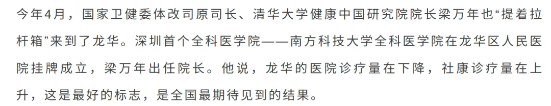 2025年南方科技大学全科医学院正式揭牌成立。学院依托龙华区人民医院建设,后者下属56个院办院管社康中心,已形成完善的全科医疗服务体系。我国全科医学领域的领军专家梁万年教授担任全科医学院院长,吴浩教授担任学术委员会主任委员。