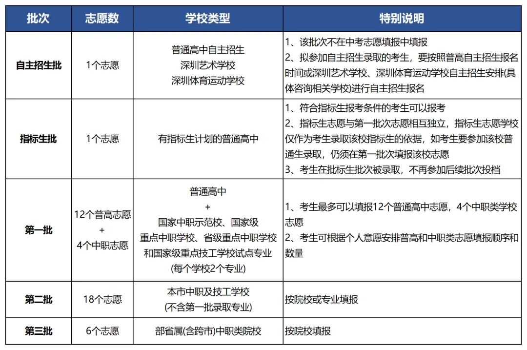 2025年深圳中考志愿填报共设5个批次,中考录取优先级为:自主招生批>指标生批>第一批次>第二批次>第三批次。