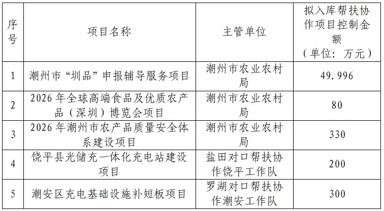 为做好深圳对口帮扶协作潮州工作,不断推进深潮协作高质量发展,经研究,拟将“潮州市‘圳品’申报辅导服务项目、2026年全球高端食品及优质农产品(深圳)博览会项目、2026年潮州市农产品质量安全体系建设项目、饶平县光储充一体化充电站建设项目、潮安区充电基础设施补短板项目”5个项目纳入深圳对口帮扶协作潮州指挥部帮扶协作资金项目库(具体项目信息,详见附件)。