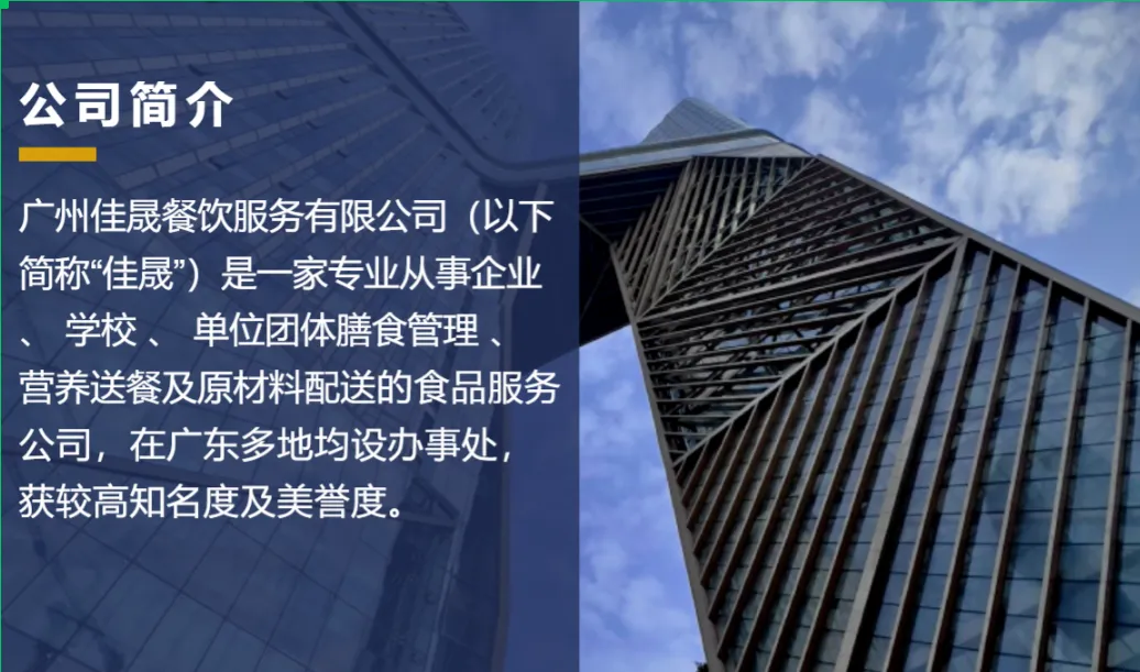 广州佳晟餐饮服务有限公司是一家专业从事企业 、学校 、单位团体膳食管理 、营养送餐及原材料(粮油 、副食 、农产品)配送的食品服务公司,现在广州 、深圳 、惠州 、佛山等地均设有办事处,在华南地区有较高的知名度和美誉度。佳晟自创建以来秉承“主动务实服务,密切配合客户需求,创新求进步”的服务宗旨, 以 “ 诚信为本 ”为原则,严格执行ISO-9001:2015质量管理体系及HACCP食品安全管理体系,不断强化运作模式,提高服务质量。凭借在珠三角等地区广大客户的信任和支持,公司已积累了丰富的餐饮管理经验,完全能够适应广大客户的餐饮需求,提高客户的团体生活质量,使企业家们从后勤管理的繁杂事务中解脱出来,以便专心致力于本职工作,为企业发挥更大的效益。佳晟餐饮提供服务多样化和餐饮专业化服务,成为集专业性、科学性与人性化服务为一体的服务先范企业。专注于为企业、学校、单位团体等机构提供膳食管理、营养送餐及原材料配送服务。