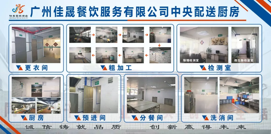 佳晟二号中央厨房及净菜食材配送位于增城国家级技术开发区,现代化的设施设备(如臭氧清洗机、异物检测仪、真空包装机、农残检测仪、瘦肉精检测仪等)加工清洗的食材,能够有效避免餐食中的异物,从而保障大家餐品的干净卫生安全。
