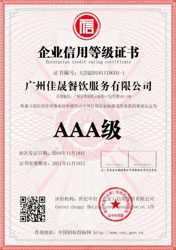 SYSTEM CETTIFICATION CERTIFIED佳晟餐饮,一家以内外标准化流程为核心,严格管理食品安全,高度智慧化运营为驱动力的企业,正以其卓越的品质和不懈的努力,默默守护着每一位顾客的健康饮食。中央厨房自动化生产设备 ,极大提升产量及食品安全品质保障能力 ,标准化的中央工厂-A级集体配餐资质 ,全程热链温控保证。