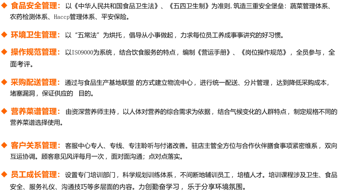 专业膳食管理:科学搭配,营养均衡。厨师团队由营养师、厨师及管理人员组成,根据客户需求制定膳食计划,确保营养均衡与美味。企业膳食注重能量补给与口味调整,随季节变化更新食谱。营养送餐服务:便捷高效,品质保障。通过冷链物流系统与食品安全管理,确保餐品快速送达且保持营养与口感。送餐服务覆盖城市主要区域,提供在线订餐与客服热线。