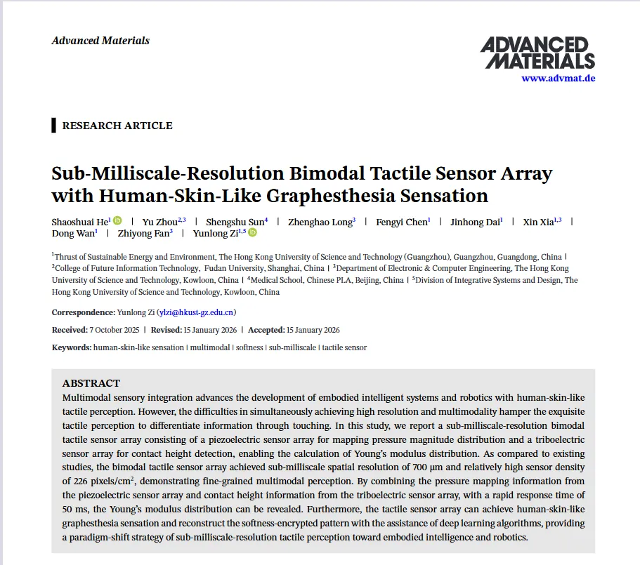 一项来自香港科技大学(广州)的突破性研究,正尝试将这份“指尖智慧”变成现实。近日,港科大(广州)功能枢纽可持续能源与环境学域訾云龙教授团队在国际顶尖期刊《Advanced Materials》上发表了最新研究成果,其团队成功研制出亚毫米级分辨率的双模态触觉传感器阵列。该技术首次实现了对物体表面软硬度分布的精细触觉感知,使机器人系统获得了接近人类指尖皮肤的感知与辨析能力。