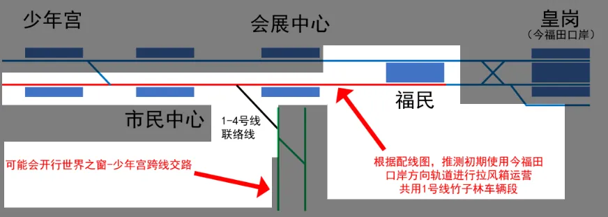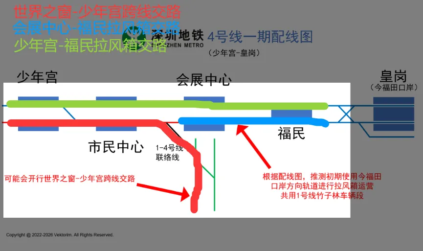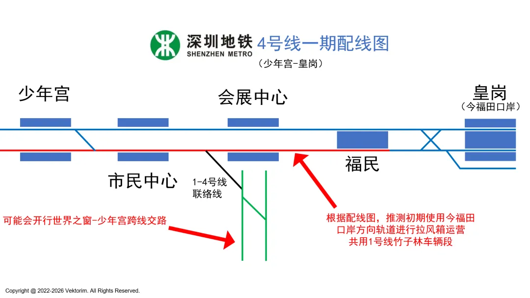 A1:和当时的情况有关,4号线一期无车辆段。设有与1号线的联络线,而4号线联络线接口就在福田口岸方向轨道,方便线路前往竹子林车辆段检修。