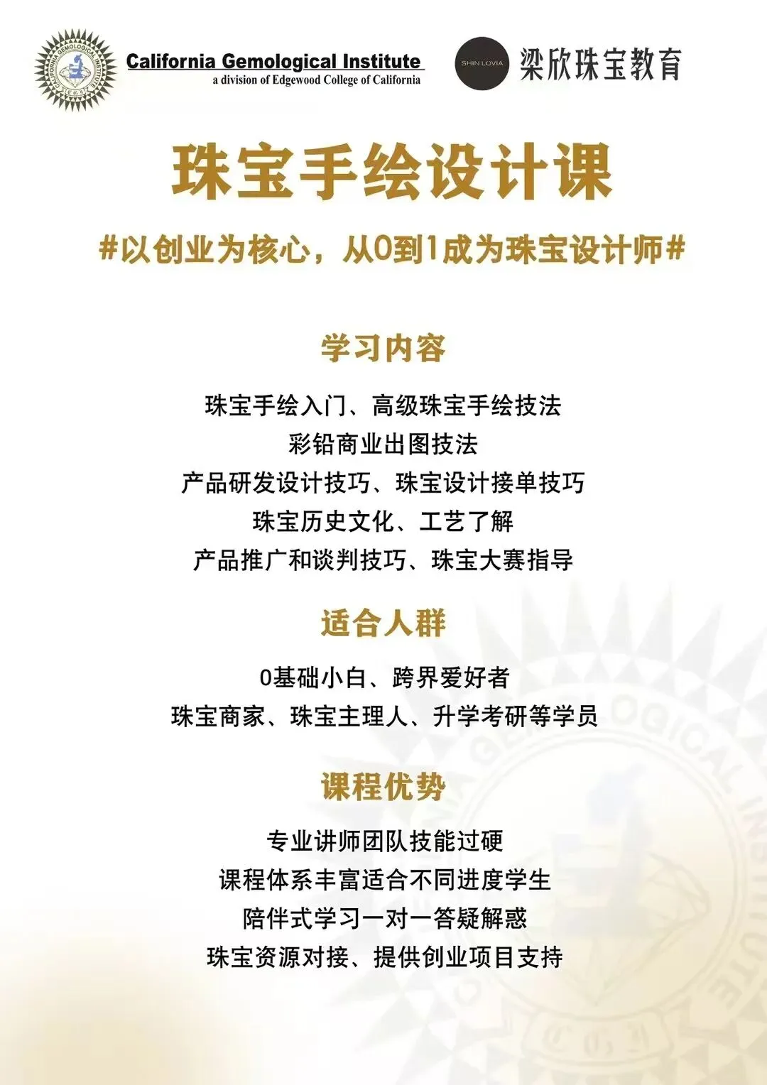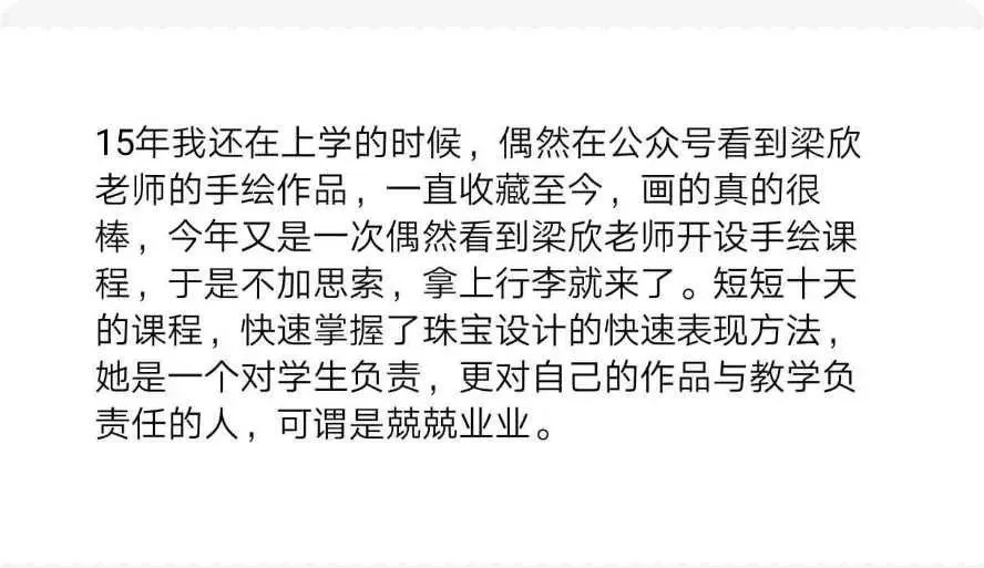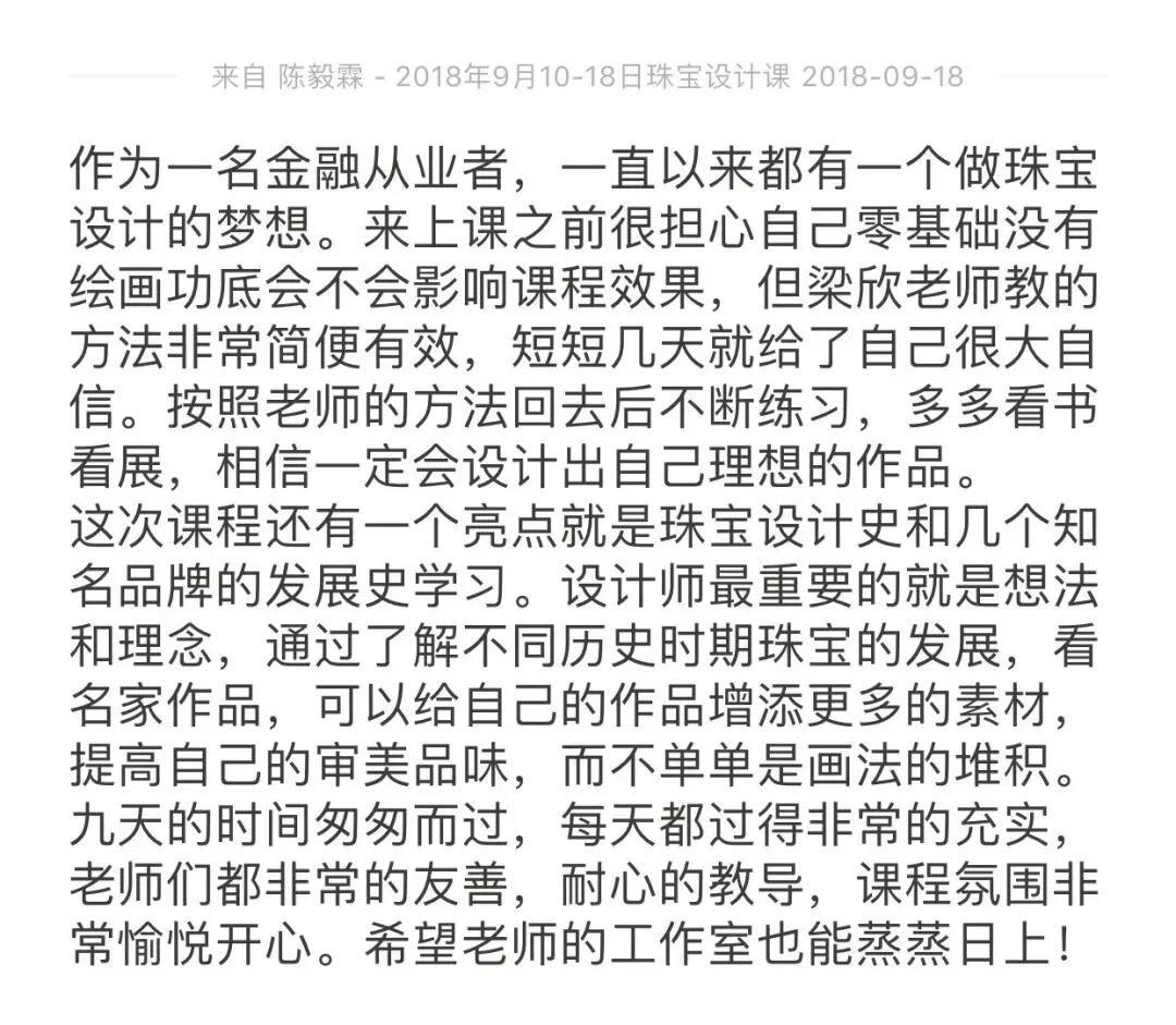 你是否还在为绘画零基础而感到焦虑?是否担心短短十天无法掌握珠宝设计的精髓?又是否忧虑学成之后无法获得持续的指导?在梁欣老师的课堂上,这些顾虑都将烟消云散。手绘是珠宝设计的基石,而选择一位优秀的老师更是成功的关键。每位老师都有独特的绘画风格,选择跟随哪位老师,就意味着选择了那种风格。梁欣(Lovia Leung)老师的风格可以用“精”“细”“美”三个字来概括,她的设计不仅仅是技艺的展现,更是艺术的升华。 珠宝设计的旅程始于艺术创作。前期广泛涉猎艺术设计,如同撒下一张大网,积累丰富的创意和灵感。只有当大脑中储备充足时,才能在需要时迅速整合、选择、提取并优化,从而满足不同的商业需求。因此,零基础的学习者从艺术创作入手,是为未来的设计之路筑牢根基。 为了满足广大同学的需求,梁欣老师精心设计了线上线下相结合的课程体系。如果你暂时无法参加线下课程,可以提前学习内容相同、课时相同的线上课程。而当你未来有线下学习的需求时,可以免费复课。更重要的是,你将获得梁欣老师终身的指导。在珠宝设计这条漫长而精彩的道路上,你无需担心忘记课程内容或绘画技巧。我们的课程始终欢迎你随时回归,且无需支付任何额外费用。梁欣老师将陪伴你一路前行,助力你勇攀珠宝设计的高峰。