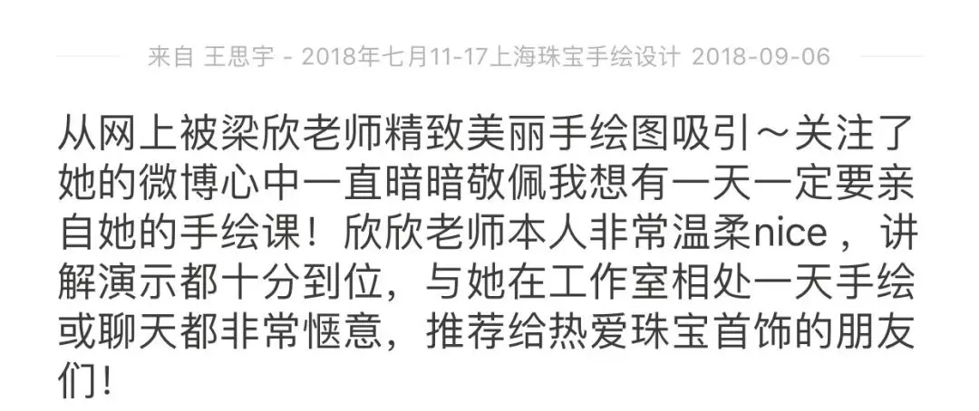 梁欣老师培养了无数珠宝行业从业者和爱好者,也为许多珠宝企业提供设计咨询服务。2017荣获年轻设计师大赛全国100强称号,2017年荣获微博设计美学“最具 V影响力”设计师,2018年设计作品《鹤仙》荣获海峡两岸珠宝设计大赛“最佳设计奖”,2019年出版《高级珠宝设计-手绘技法教程》。梁欣老师编著《高级珠宝设计-手绘技法教程》新书发布丰富的设计经验结合超前的教学思维,从客户和学员角度出发,敏锐的市场嗅觉和过硬的自身才能让梁欣老师成为无数学生和客人心中的兼具亲和力、幽默和实干的美丽老师和设计师。梁欣老师个人手绘作品