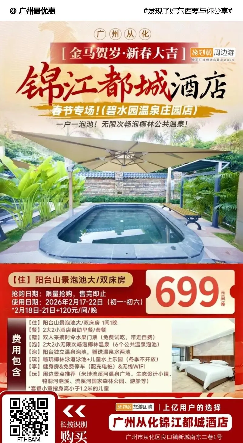 春节专场699元住广州从化锦江都城酒店(碧水园温泉庄园店)阳台泡池房,自助早餐+健身房!配备烧烤场/KTV/充电桩等,无限次畅泡椰林温泉
