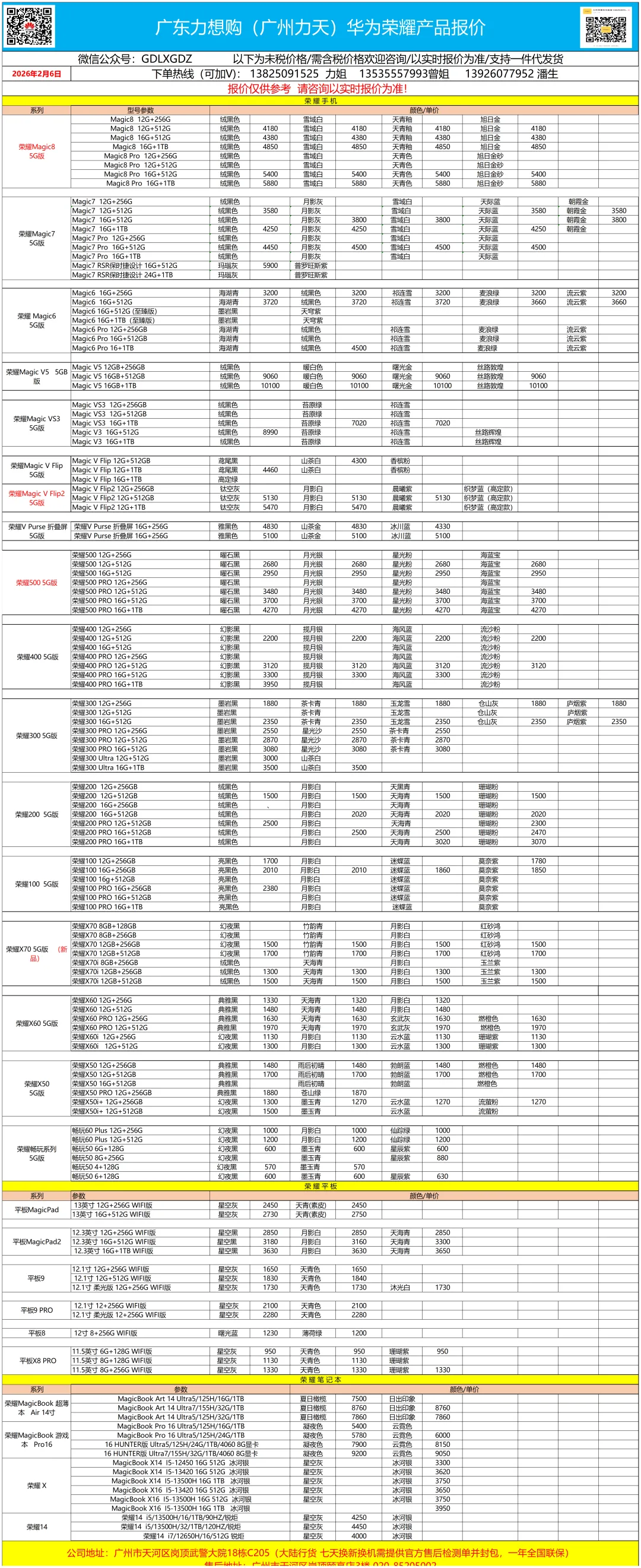 2026.2.6广州力天(广东力想购)华为荣耀报价