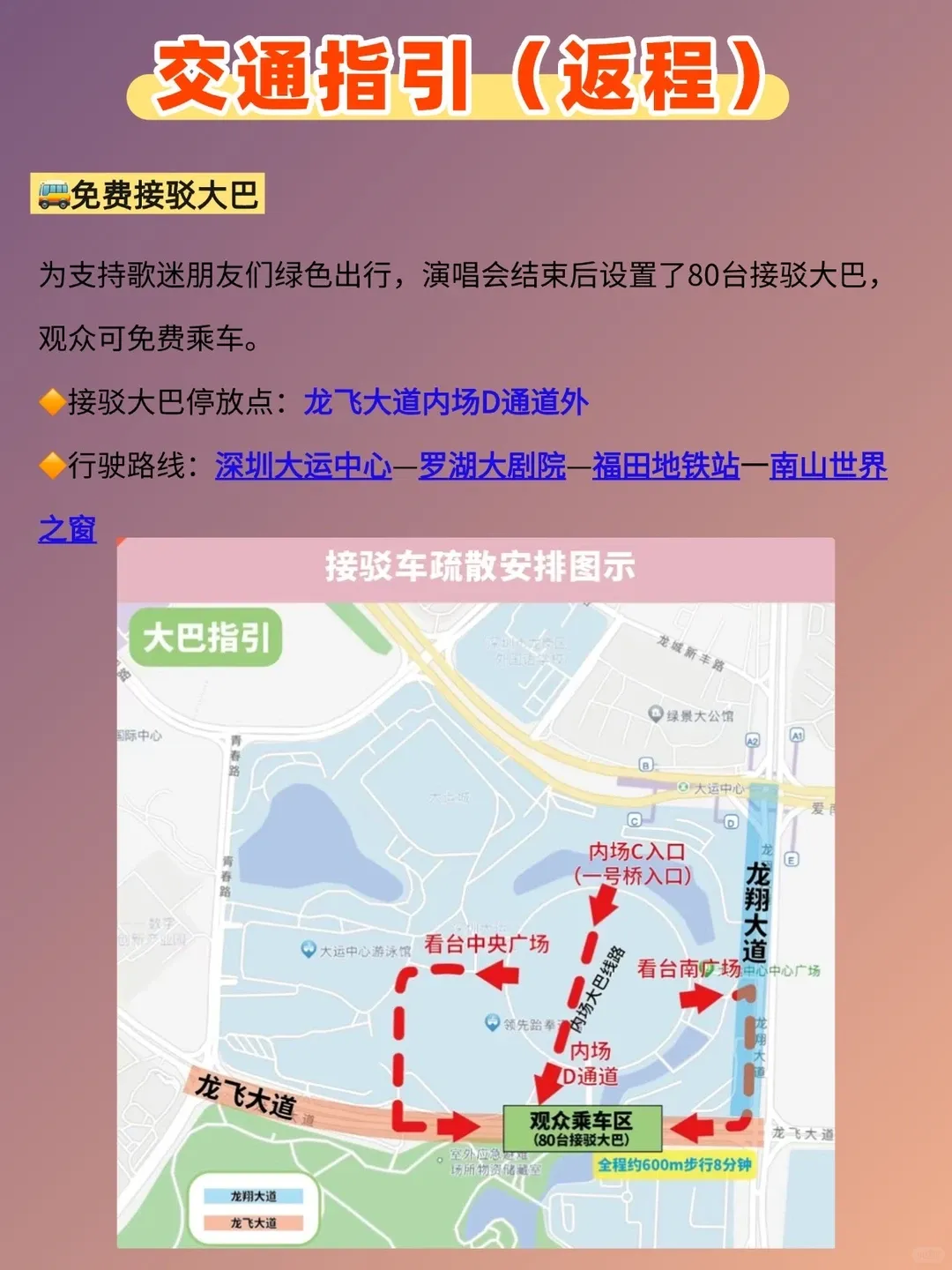 #返程免费接驳大巴为支持歌迷朋友们绿色出行,演唱会结束后设置了80台接驳大巴,观众可免费乘车。