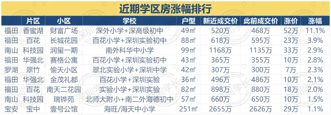 福田华强北的赛格公寓(深实验初中)、罗湖翠竹的愉天小区(深圳中学)、南山科技园的瑞铧苑(南二外海德初中),最近都在涨。