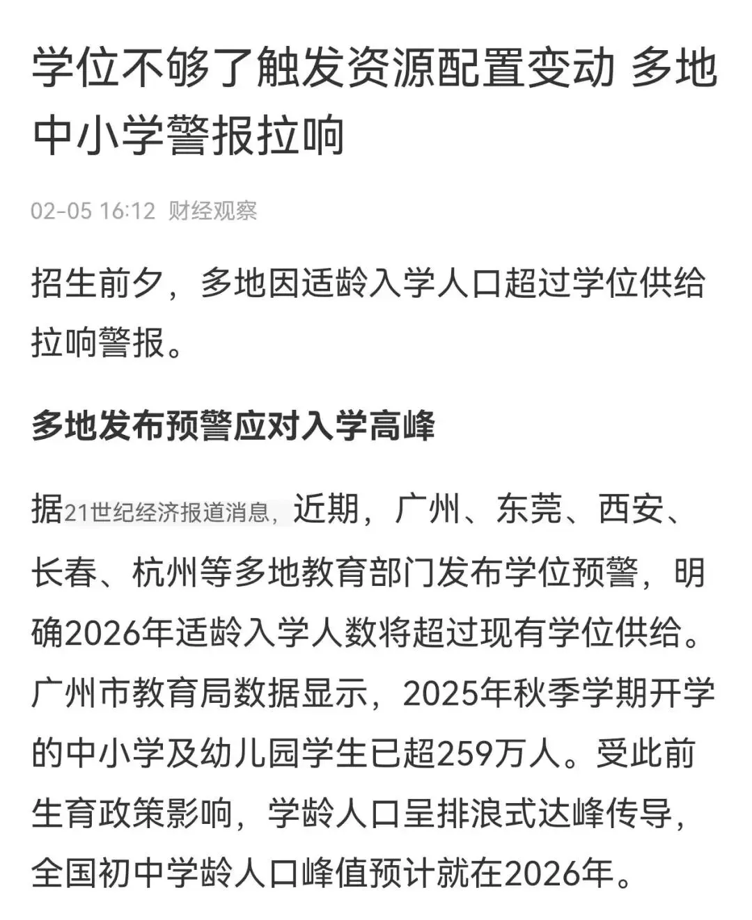 21世纪经济报道最近披露:广州、东莞、西安、杭州多地发布学位预警,2026年适龄入学人数将超过现有学位供给。