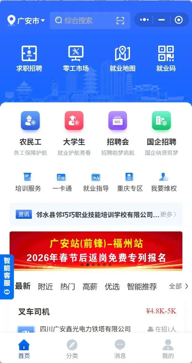 主办方提醒大家,免费专列将于2026年2月6日开放报名系统,通过“广安安心就业”微信小程序报名参与。报名成功后,将于2月7日前通过手机短信方式告知本人,请务必保持通信工具畅通。