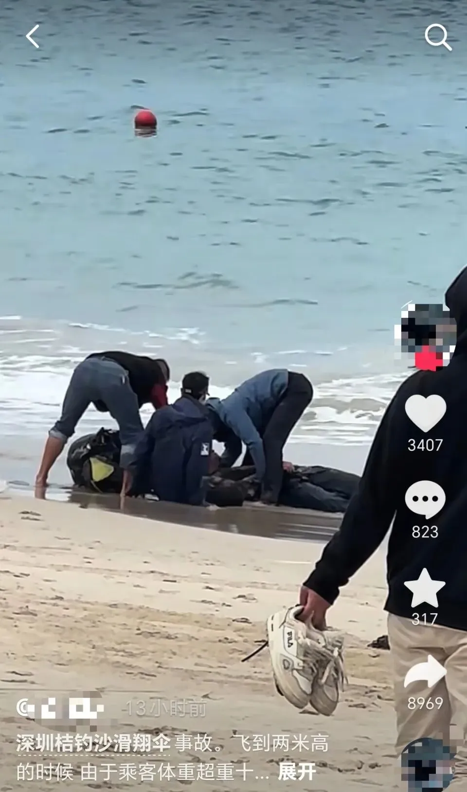 近日,有网民发布视频称,深圳桔钓沙沙滩有游客乘坐滑翔伞时坠落海岸。相关视频显示,一名男性躺在沙滩边,旁边围着多名人员疑似在为他实施紧急救援。