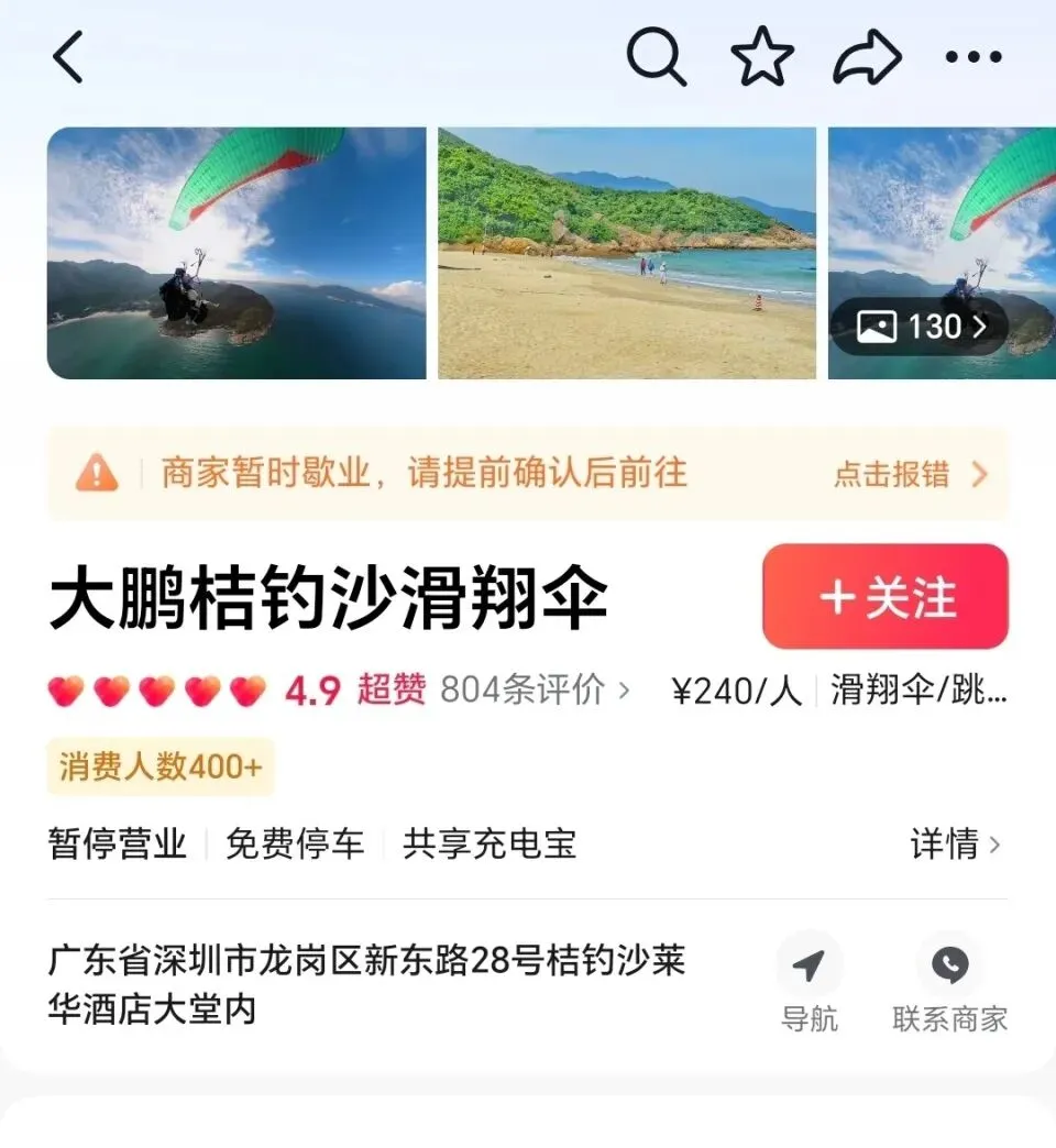 九派新闻经多方确认,涉事商家为深圳“大鹏桔钓沙滑翔伞”。记者在多个线上平台查询发现,目前该商家已暂停营业。