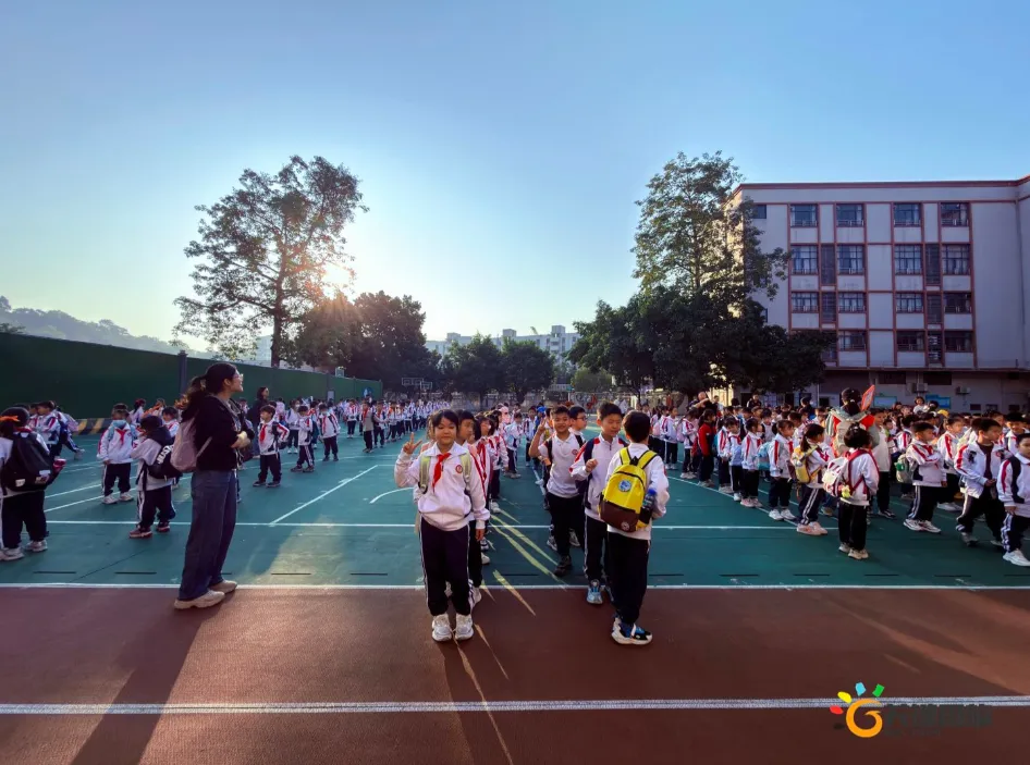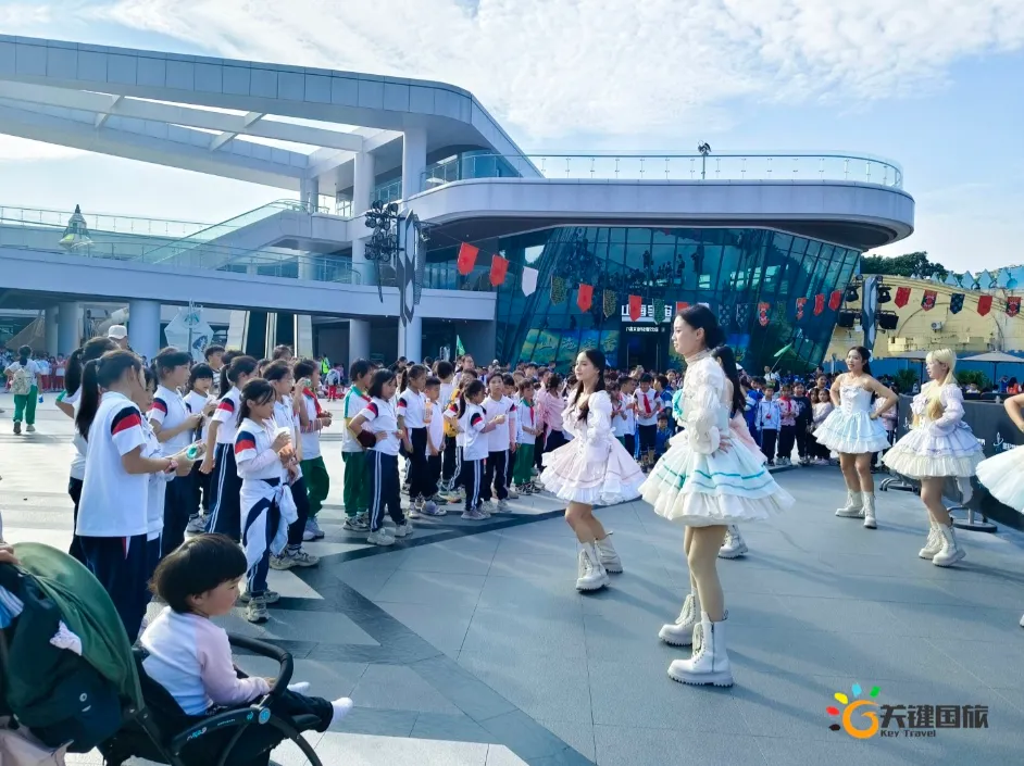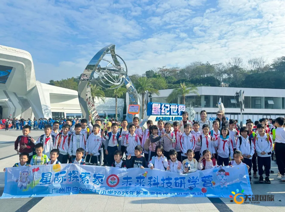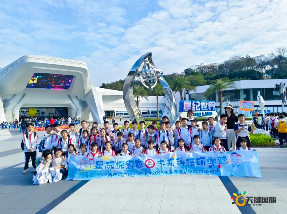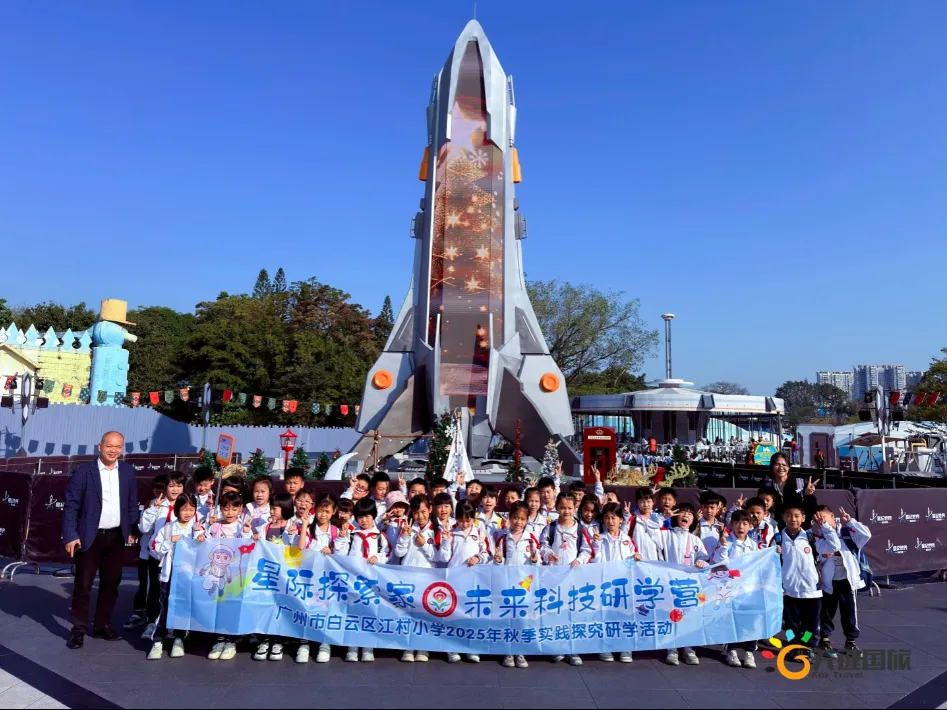 2025年12月8日、9日、11日广州市白云区江村小学的1200余名师生怀揣着对宇宙的无限好奇与探索热情,列队前往星纪世界・南湖乐园——这座由老广童年记忆“南湖乐园”全新升级而成的国内首个RPG科幻主题研学基地,开启一场别开生面的“星际探索家·未来科技研学营”研学之旅。当飞船造型的“南湖星门”缓缓映入眼帘,炫彩LED屏幕流转着浩瀚星河与未来光影,仿佛时空之门已然开启,同学们的欢呼声瞬间点燃了这场沉浸式星际探险的序幕。清晨8点的校园,已是欢声笑语一片。同学们整齐列队,认真聆听行前安全教育后,怀着激动的心情踏上旅程。大巴车上,讨论声、欢笑声此起彼伏,对即将到来的科技体验,每个人都充满期待。