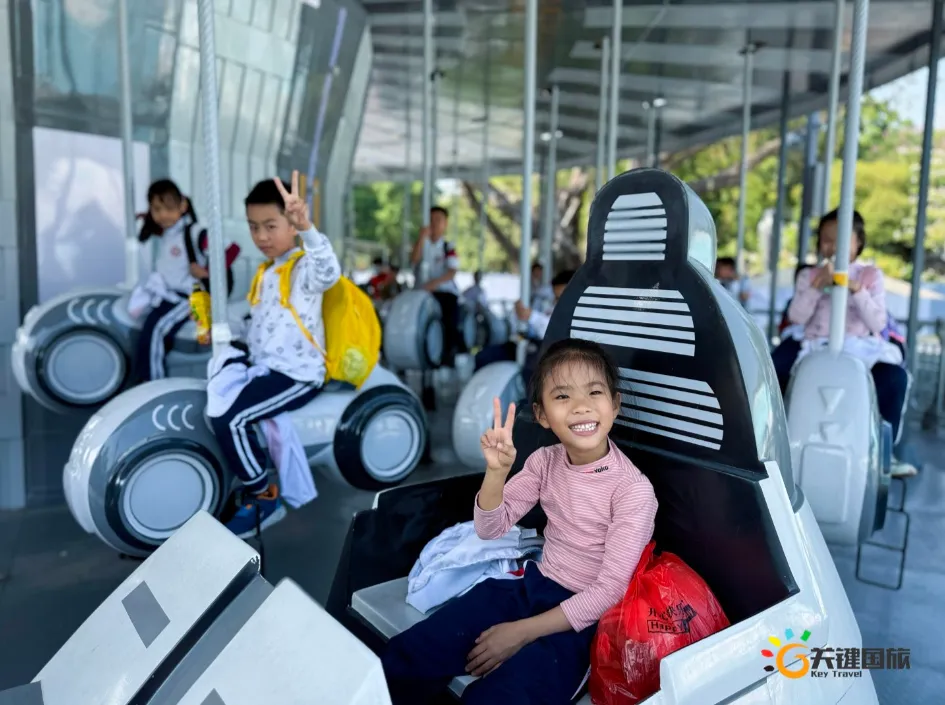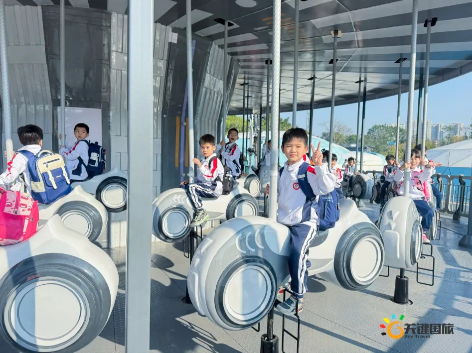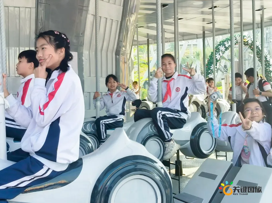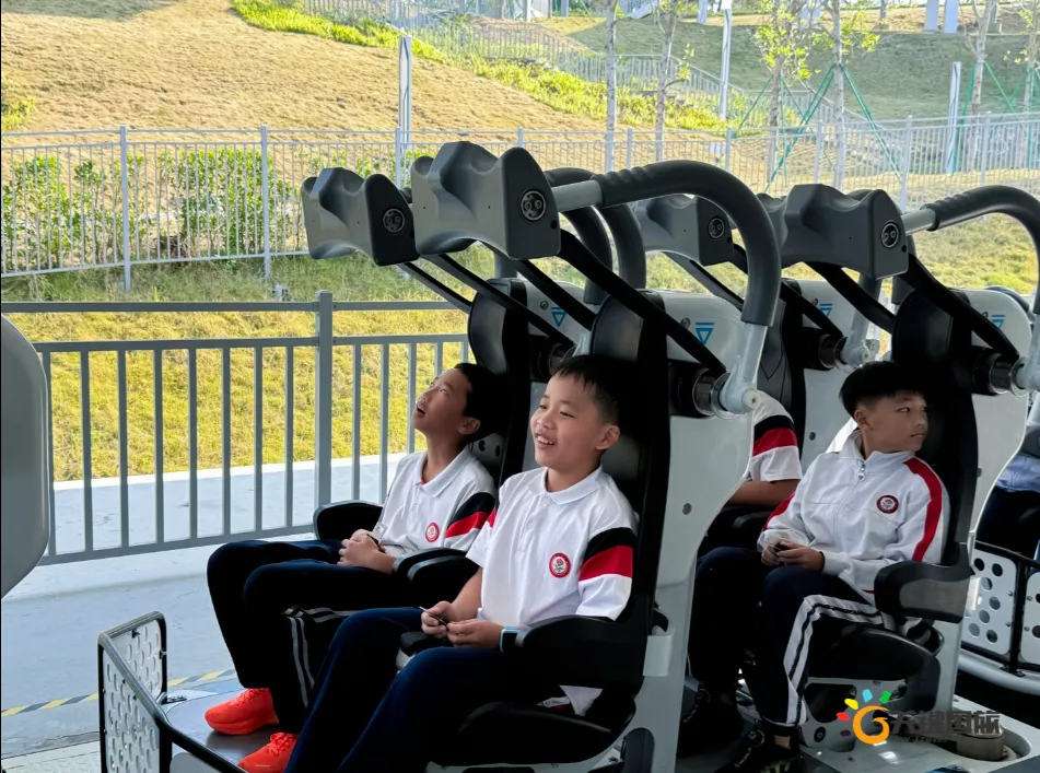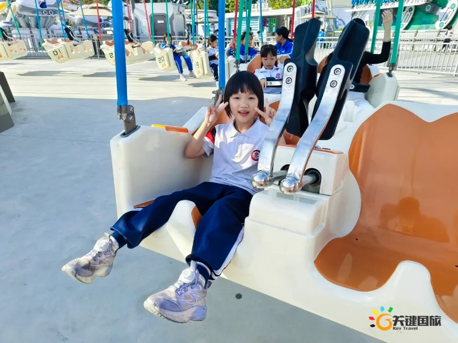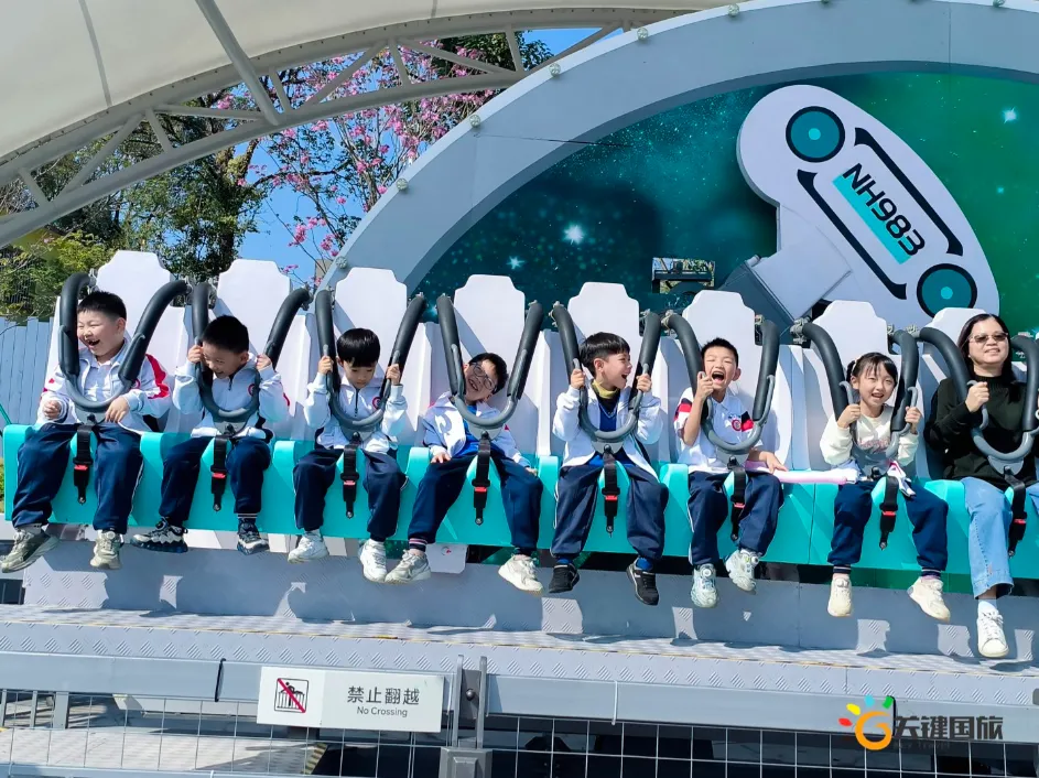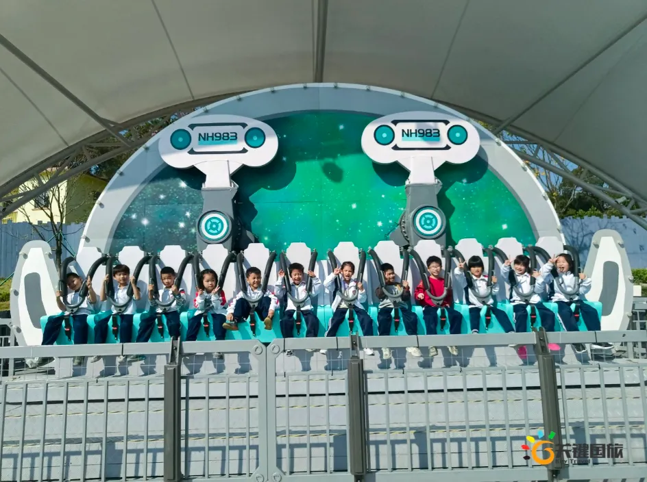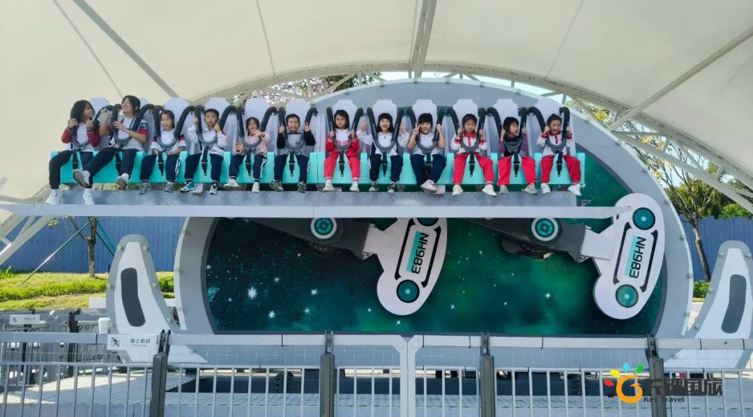 各班师生陆续抵达目的地,在乐园入口处拍摄了充满朝气的集体合影,为本次研学之旅留下了第一张珍贵记忆。作为广州历史悠久、广受喜爱的主题乐园,星纪世界·南湖乐园以焕然一新的“未来科技”主题场景,迎接江村小学的学子们。在这里,一场融合智慧启迪、科学探索与想象力激发的研学之旅正式启程——这不仅是一次出行,更是一堂行走中的成长课堂,带领孩子们在体验中学习,在探索中发现,向着更广阔的未来迈出坚实一步。在“光子奇航”过山车上,同学们的阵阵惊呼与畅快呐喊,正是对加速度最生动的物理课堂;“太空梯”旋转椅徐徐升起,大家在起伏回转间亲身体验失重与平衡的奇妙原理;“星跃之旅”5D影院中,此起彼伏的惊叹仿佛真的穿越虫洞,踏上了一段真实的星际旅程;而“星辕”观光小火车里,欢声笑语随着铁轨蔓延,沿途风景如画,轻松惬意中满载着探索的愉悦……更多精彩项目,仍在等待着同学们一一解锁、亲身感受。