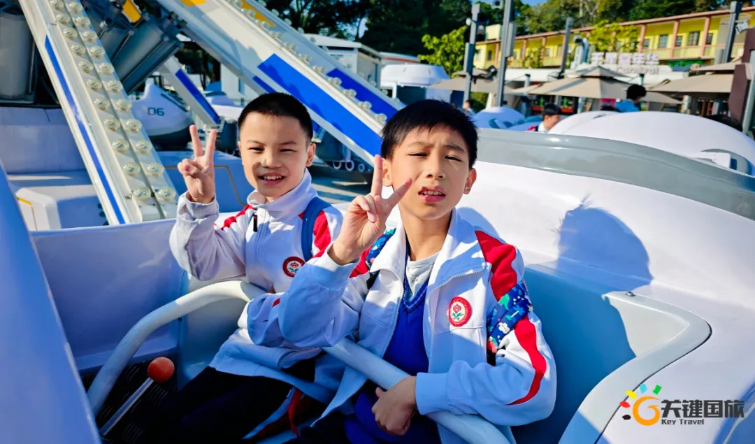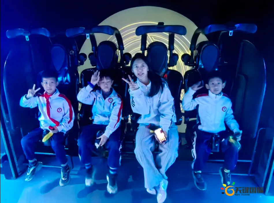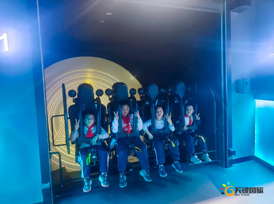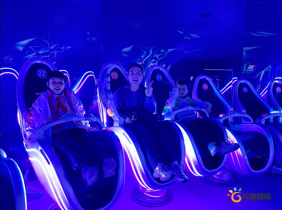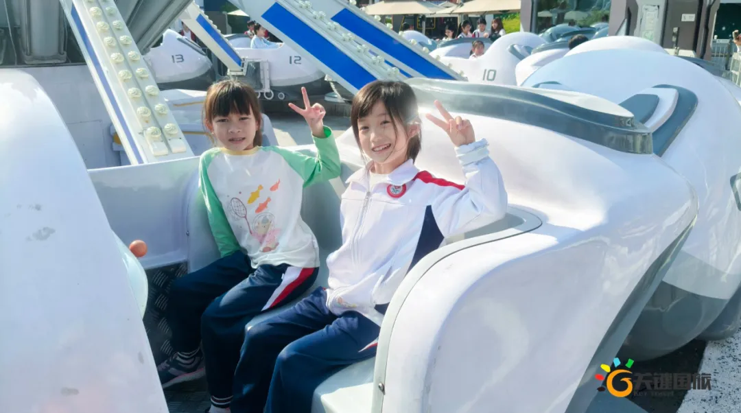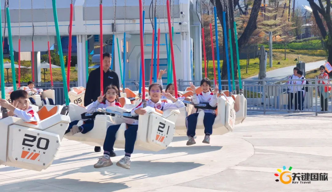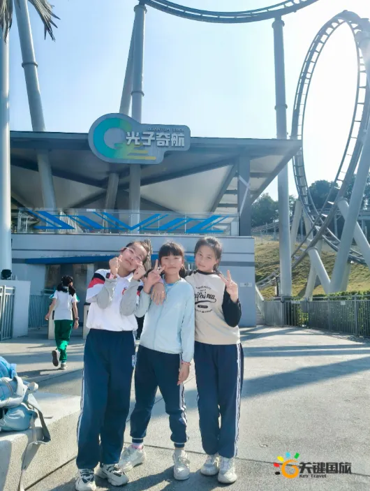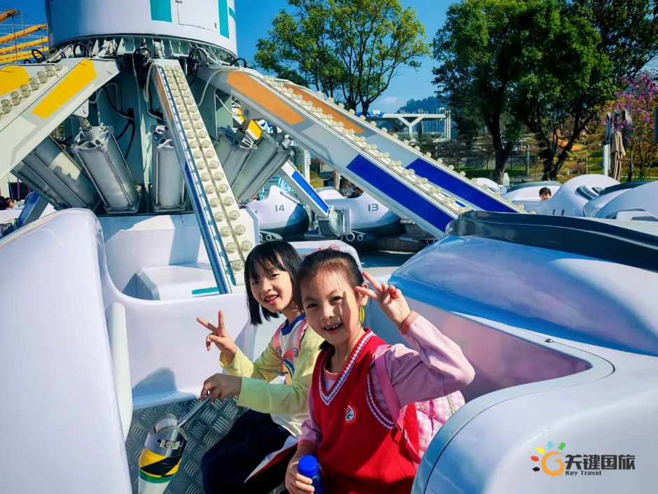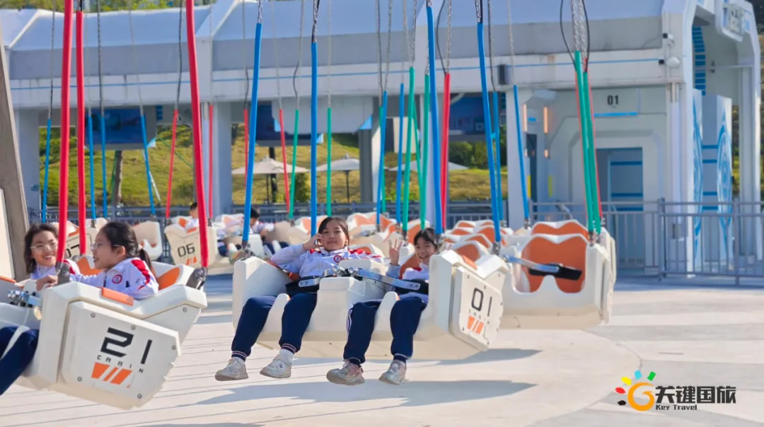 各班师生陆续抵达目的地,在乐园入口处拍摄了充满朝气的集体合影,为本次研学之旅留下了第一张珍贵记忆。作为广州历史悠久、广受喜爱的主题乐园,星纪世界·南湖乐园以焕然一新的“未来科技”主题场景,迎接江村小学的学子们。在这里,一场融合智慧启迪、科学探索与想象力激发的研学之旅正式启程——这不仅是一次出行,更是一堂行走中的成长课堂,带领孩子们在体验中学习,在探索中发现,向着更广阔的未来迈出坚实一步。在“光子奇航”过山车上,同学们的阵阵惊呼与畅快呐喊,正是对加速度最生动的物理课堂;“太空梯”旋转椅徐徐升起,大家在起伏回转间亲身体验失重与平衡的奇妙原理;“星跃之旅”5D影院中,此起彼伏的惊叹仿佛真的穿越虫洞,踏上了一段真实的星际旅程;而“星辕”观光小火车里,欢声笑语随着铁轨蔓延,沿途风景如画,轻松惬意中满载着探索的愉悦……更多精彩项目,仍在等待着同学们一一解锁、亲身感受。