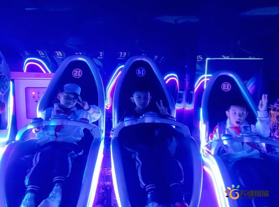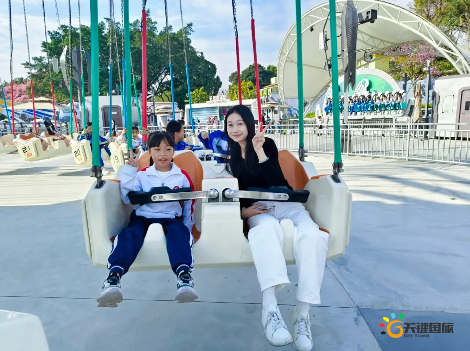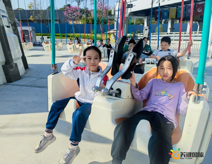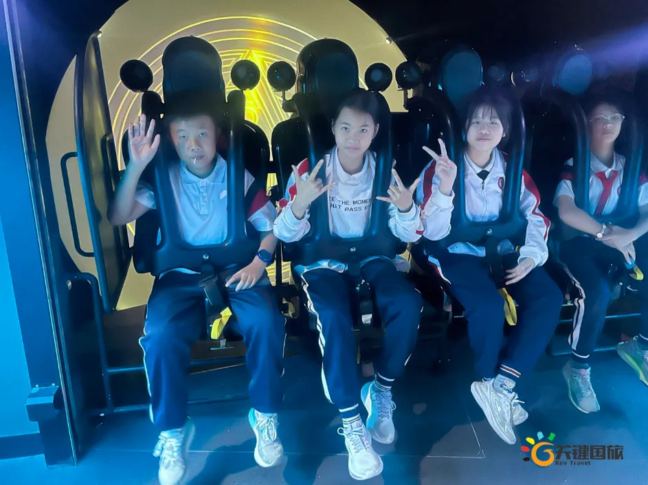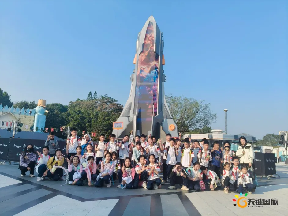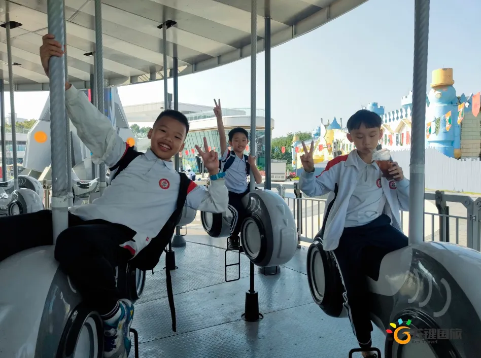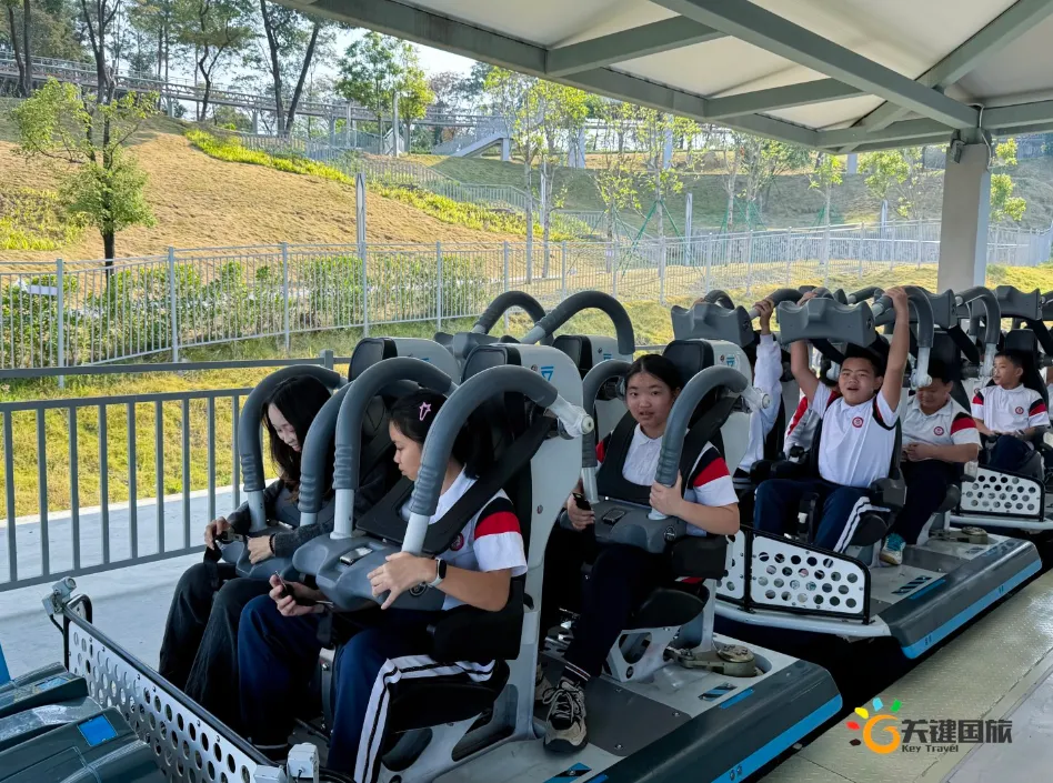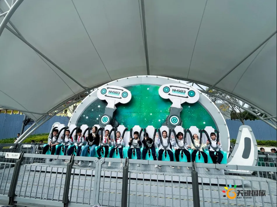 各班师生陆续抵达目的地,在乐园入口处拍摄了充满朝气的集体合影,为本次研学之旅留下了第一张珍贵记忆。作为广州历史悠久、广受喜爱的主题乐园,星纪世界·南湖乐园以焕然一新的“未来科技”主题场景,迎接江村小学的学子们。在这里,一场融合智慧启迪、科学探索与想象力激发的研学之旅正式启程——这不仅是一次出行,更是一堂行走中的成长课堂,带领孩子们在体验中学习,在探索中发现,向着更广阔的未来迈出坚实一步。在“光子奇航”过山车上,同学们的阵阵惊呼与畅快呐喊,正是对加速度最生动的物理课堂;“太空梯”旋转椅徐徐升起,大家在起伏回转间亲身体验失重与平衡的奇妙原理;“星跃之旅”5D影院中,此起彼伏的惊叹仿佛真的穿越虫洞,踏上了一段真实的星际旅程;而“星辕”观光小火车里,欢声笑语随着铁轨蔓延,沿途风景如画,轻松惬意中满载着探索的愉悦……更多精彩项目,仍在等待着同学们一一解锁、亲身感受。