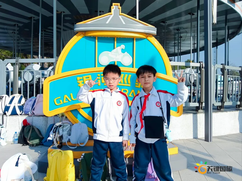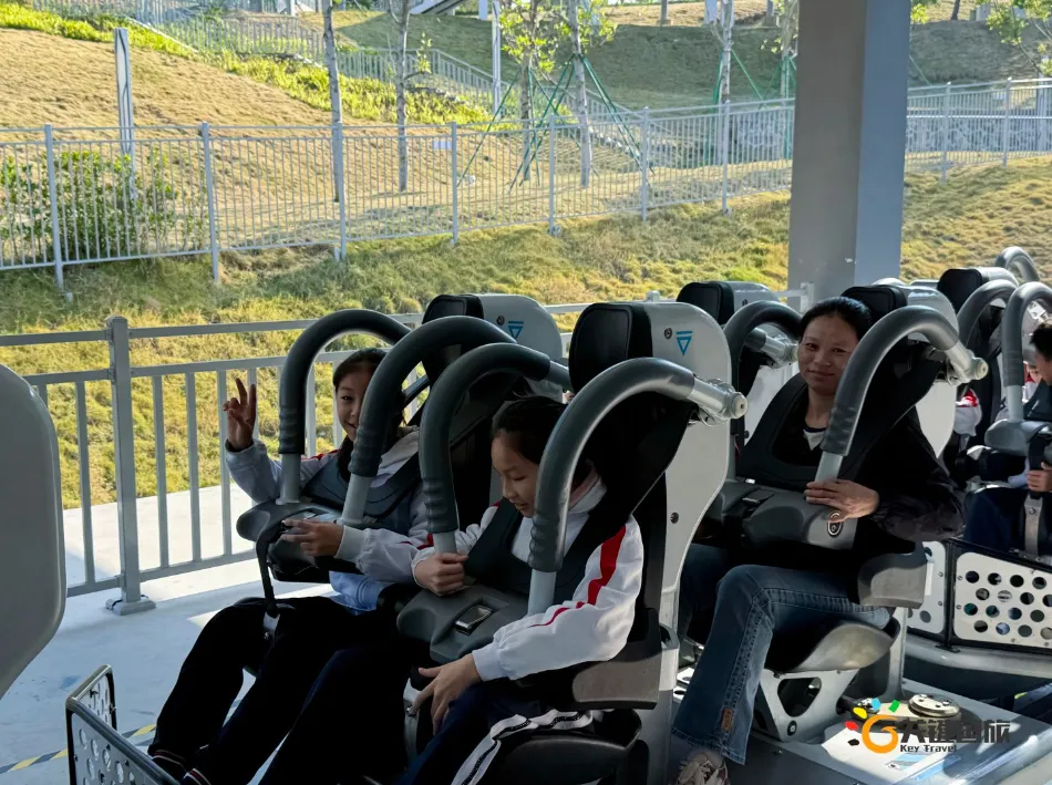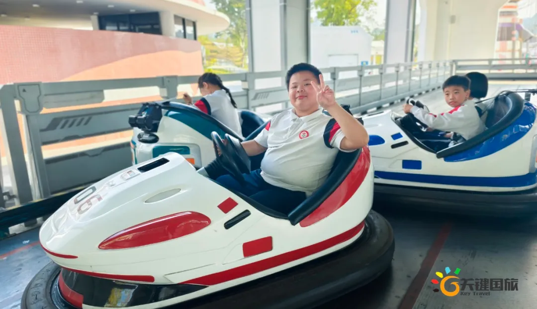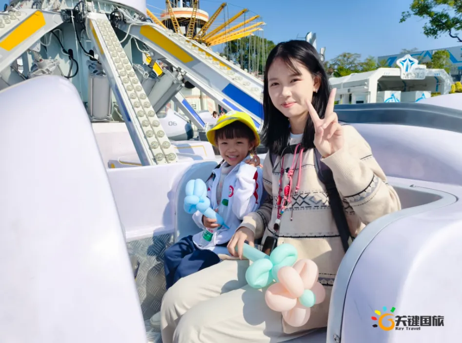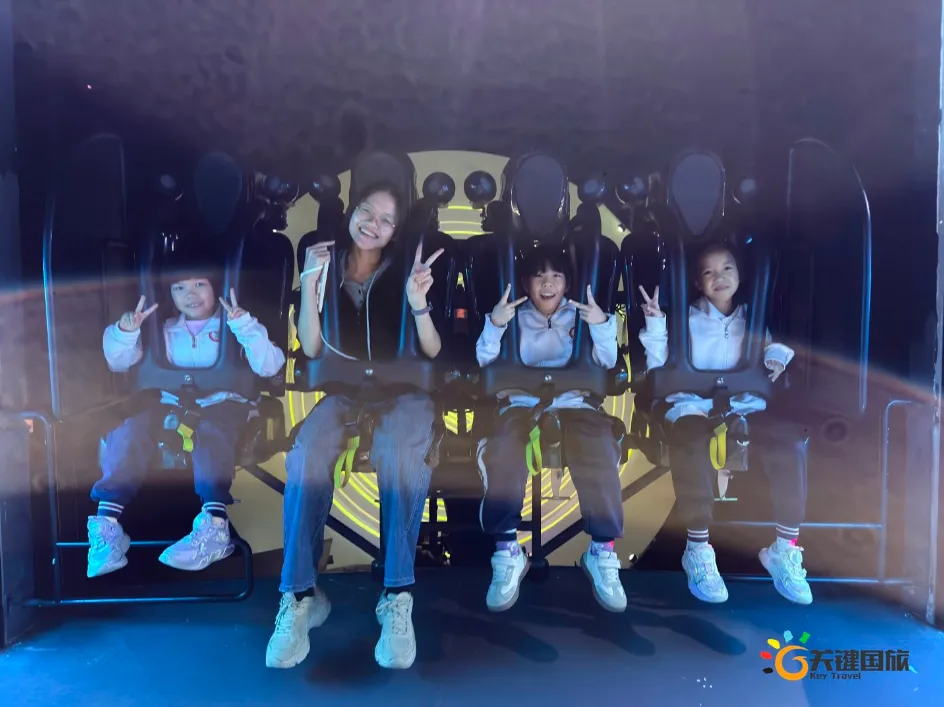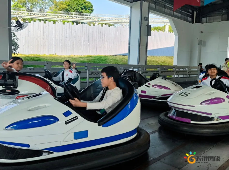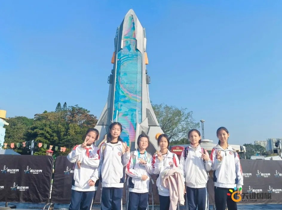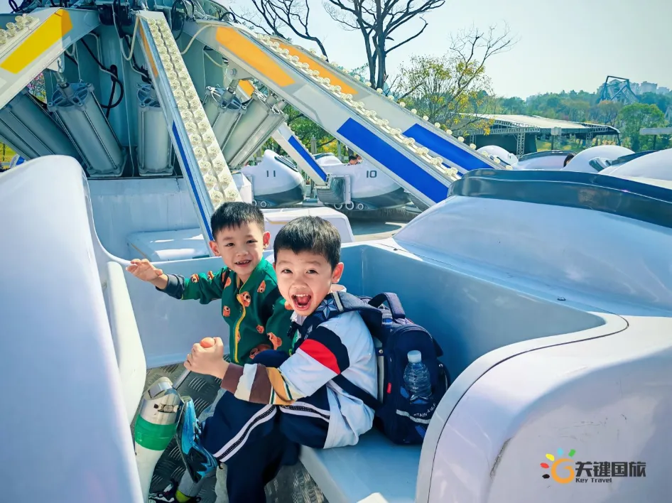 各班师生陆续抵达目的地,在乐园入口处拍摄了充满朝气的集体合影,为本次研学之旅留下了第一张珍贵记忆。作为广州历史悠久、广受喜爱的主题乐园,星纪世界·南湖乐园以焕然一新的“未来科技”主题场景,迎接江村小学的学子们。在这里,一场融合智慧启迪、科学探索与想象力激发的研学之旅正式启程——这不仅是一次出行,更是一堂行走中的成长课堂,带领孩子们在体验中学习,在探索中发现,向着更广阔的未来迈出坚实一步。在“光子奇航”过山车上,同学们的阵阵惊呼与畅快呐喊,正是对加速度最生动的物理课堂;“太空梯”旋转椅徐徐升起,大家在起伏回转间亲身体验失重与平衡的奇妙原理;“星跃之旅”5D影院中,此起彼伏的惊叹仿佛真的穿越虫洞,踏上了一段真实的星际旅程;而“星辕”观光小火车里,欢声笑语随着铁轨蔓延,沿途风景如画,轻松惬意中满载着探索的愉悦……更多精彩项目,仍在等待着同学们一一解锁、亲身感受。
