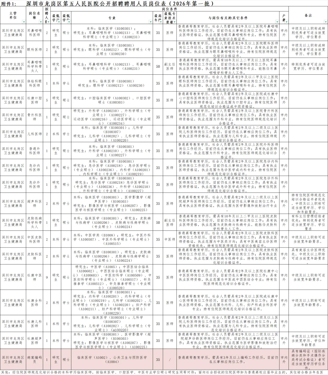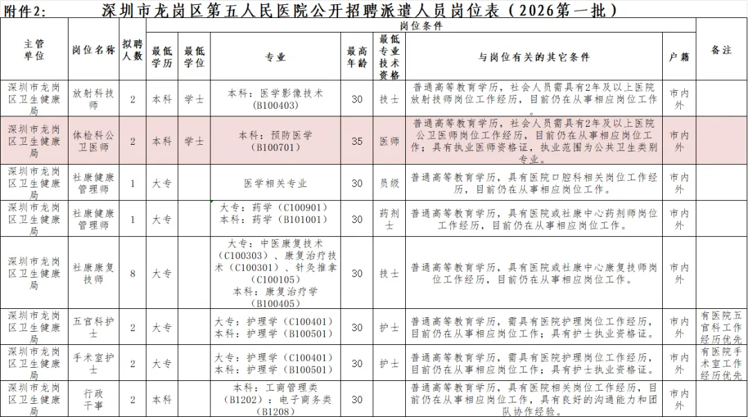 具体招聘岗位、人数和岗位条件详见附件《深圳市龙岗区第五人民医院2026年公开招聘岗位汇总表》。