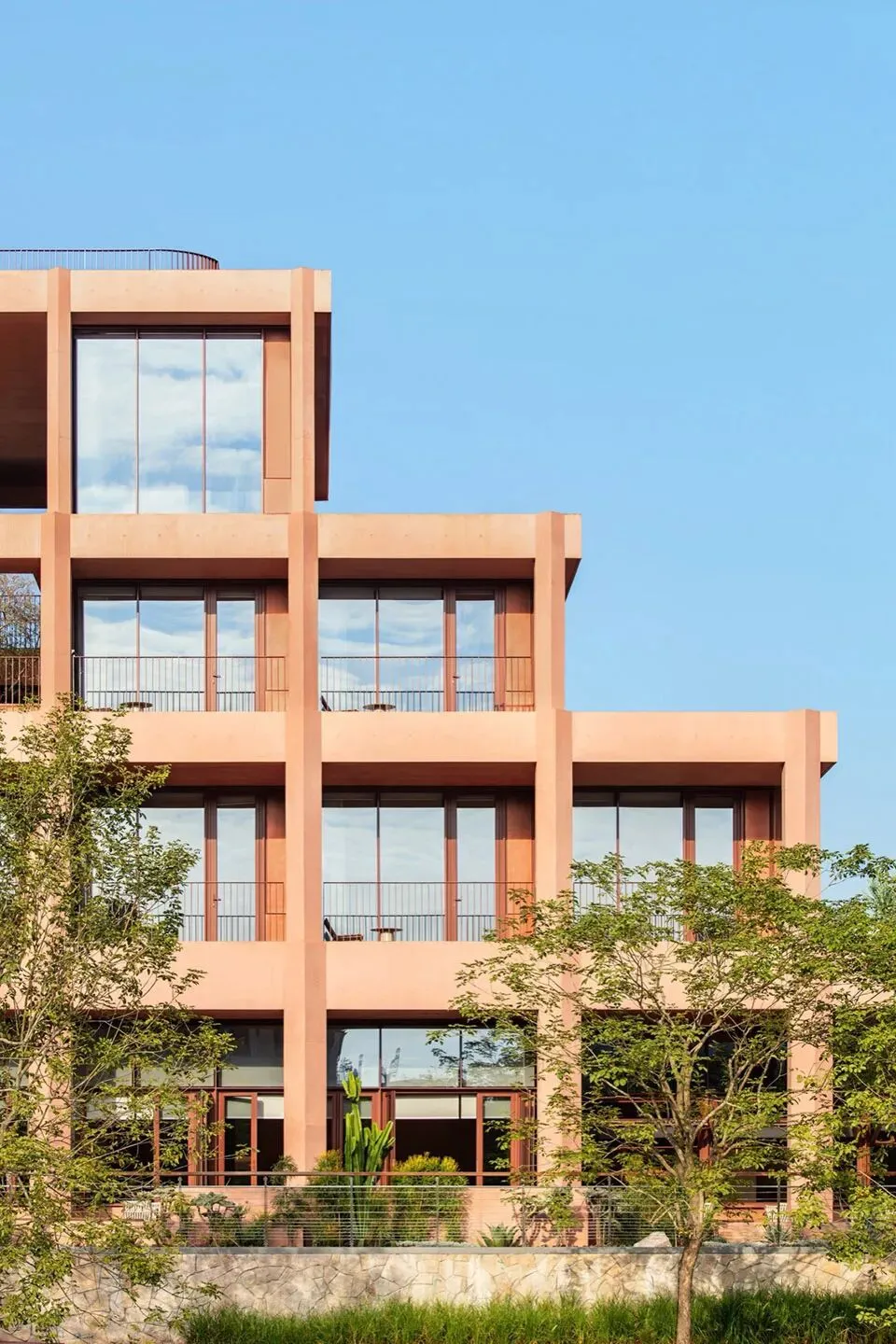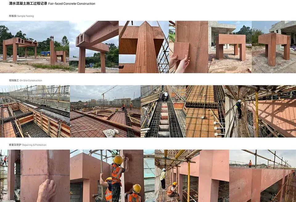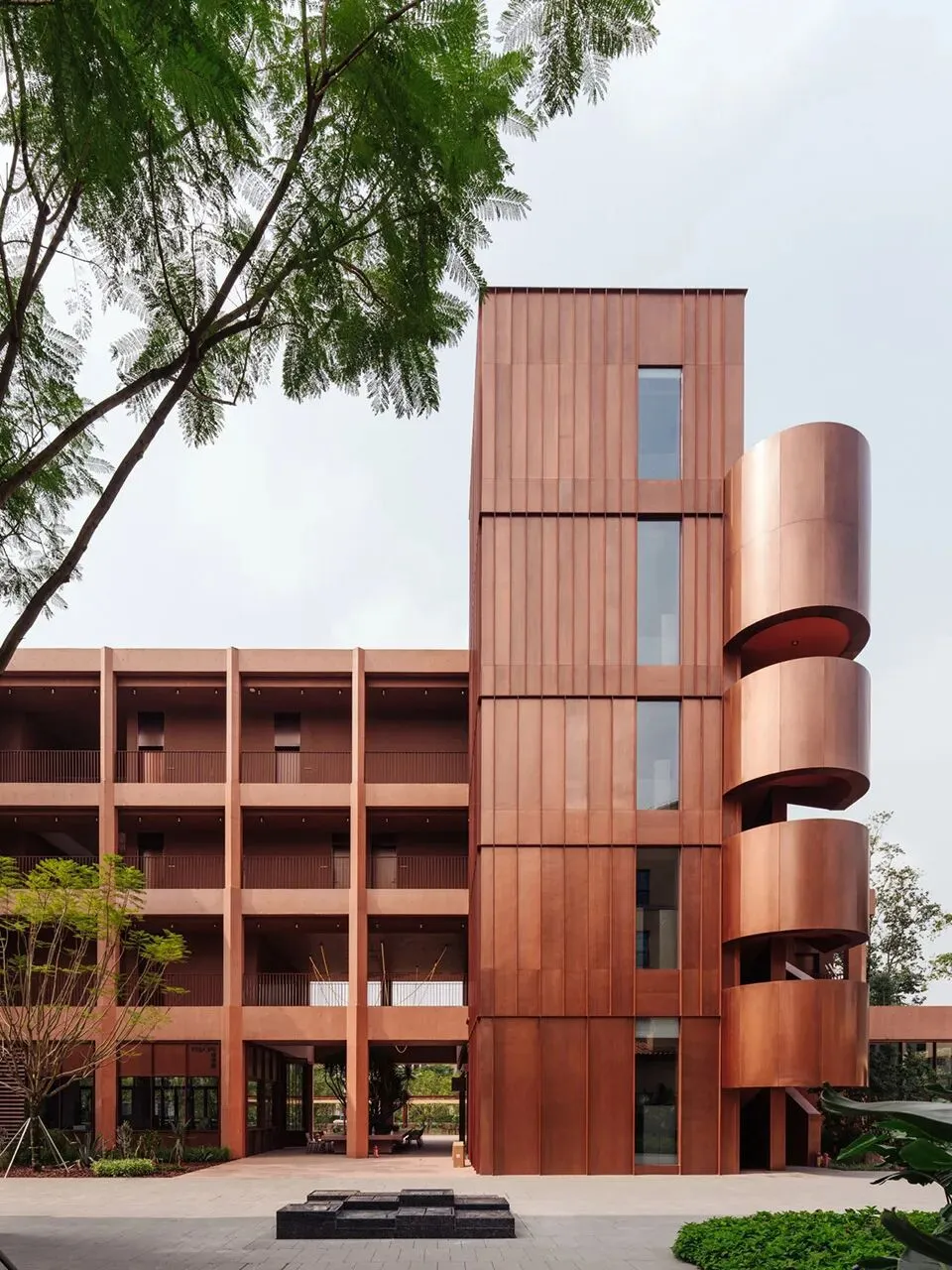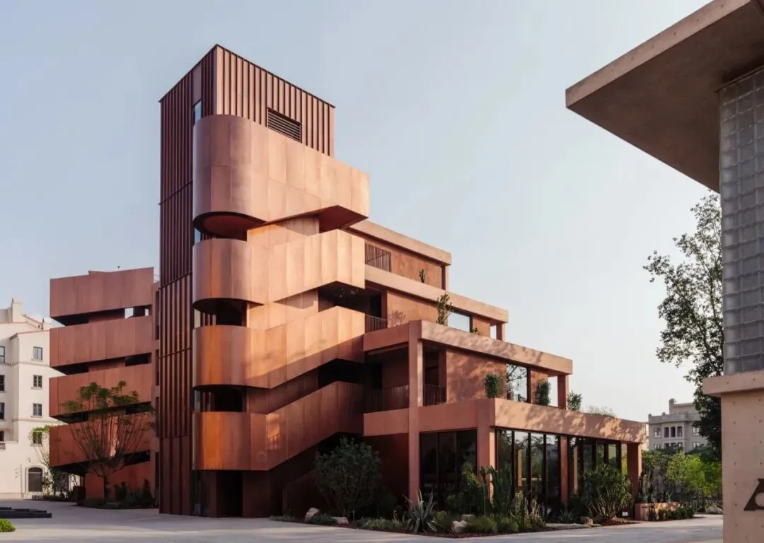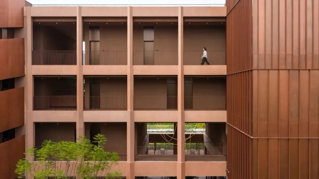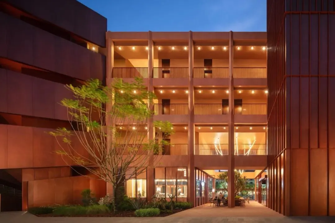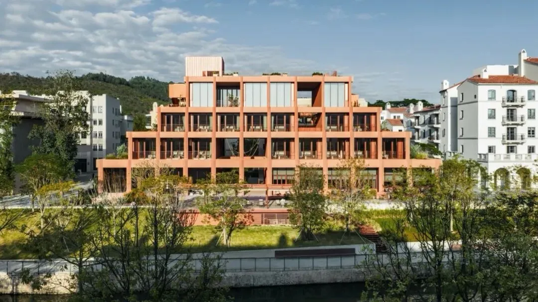 在材料方面我们选择使用红色清水混凝土来呈现建筑的主体结构,混凝土一次浇筑成型,将结构与材料最真实的呈现。低饱和度的红色像是老砖的颜色 ,也像是泥土的颜色,与混凝土天然、粗粝的质感结合,给人温暖的感觉。红色随着时间微妙的变换色调,让建筑有了表情和生命力,像是在和背后的群山一起生长。晴天时,红色的建筑与水中的倒影相呼映衬,更多了一分灵动。在与环境的对话之中,立面直线网格的坚实和厚感被柔化了,营造出轻盈的感知。与红色混凝土搭配使用的乱纹红铜板,运用在室外疏散楼梯、核心筒的外立面。金属的精致冷峻与混凝土的粗温润,在对比中加强了立面的层次感。整体材质明快的色调也让建筑从青山绿水之间跳脱出来,充满活力和愉悦的度假氛围。