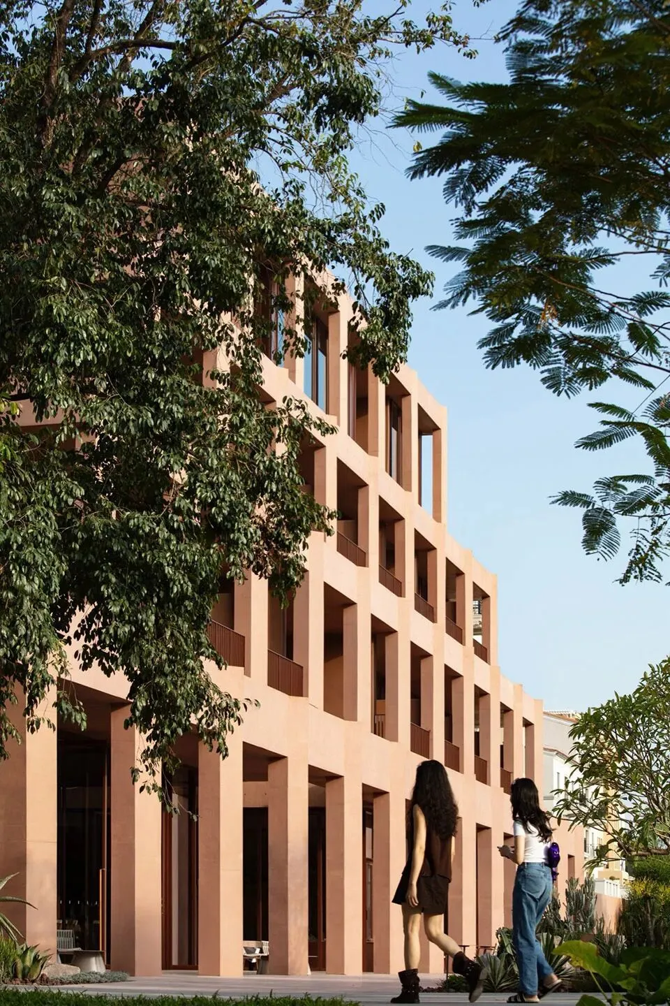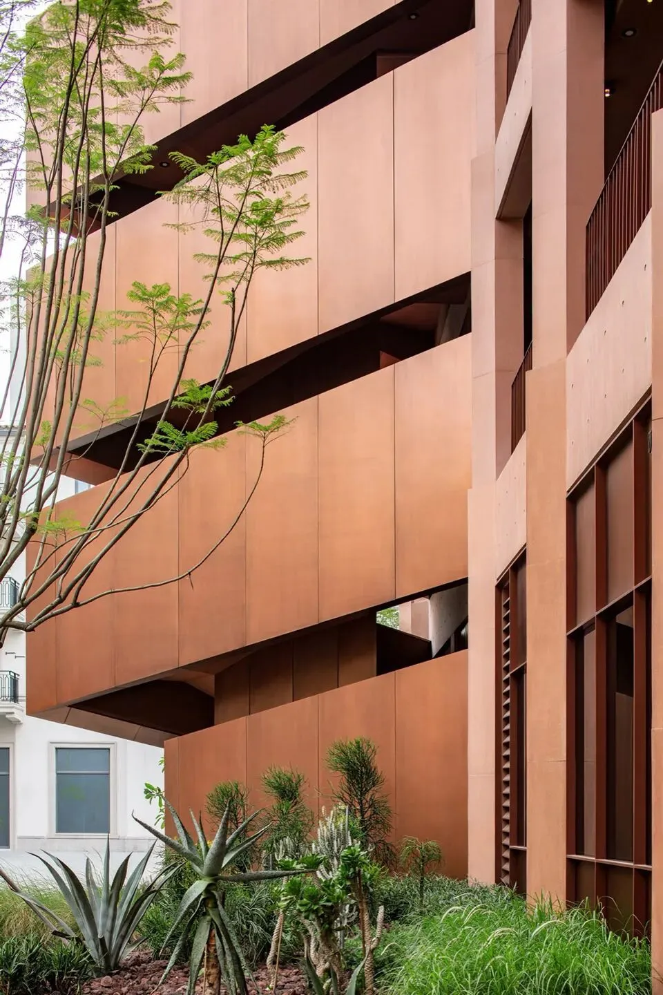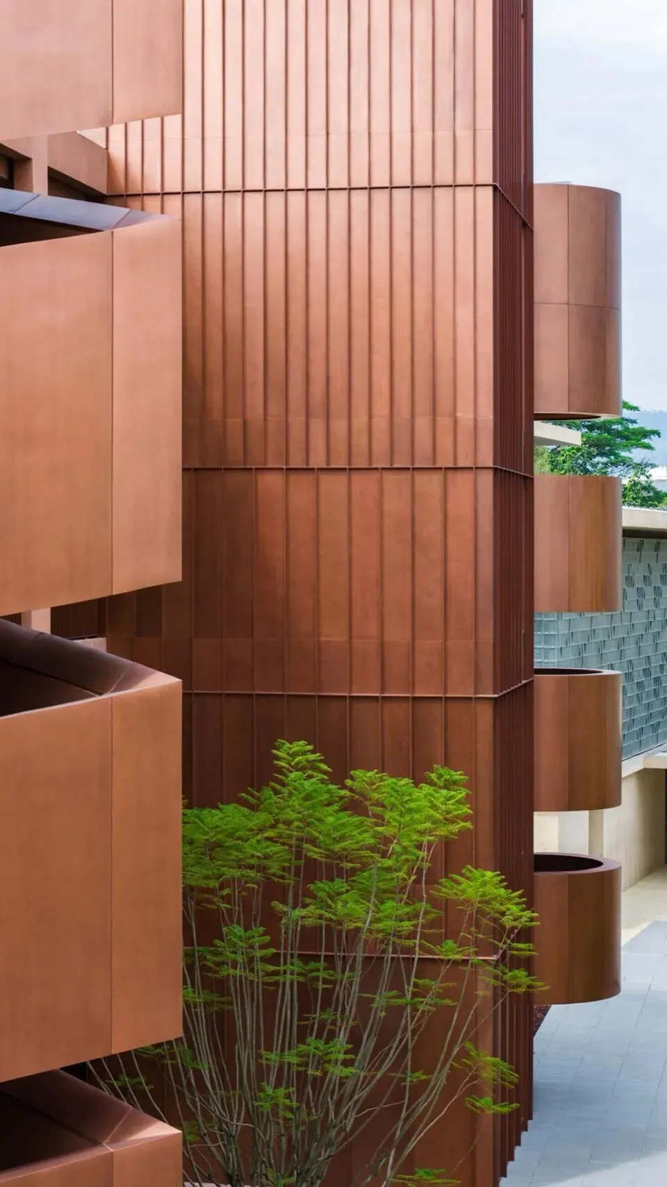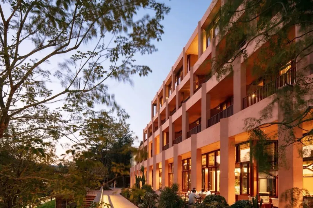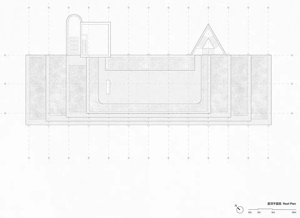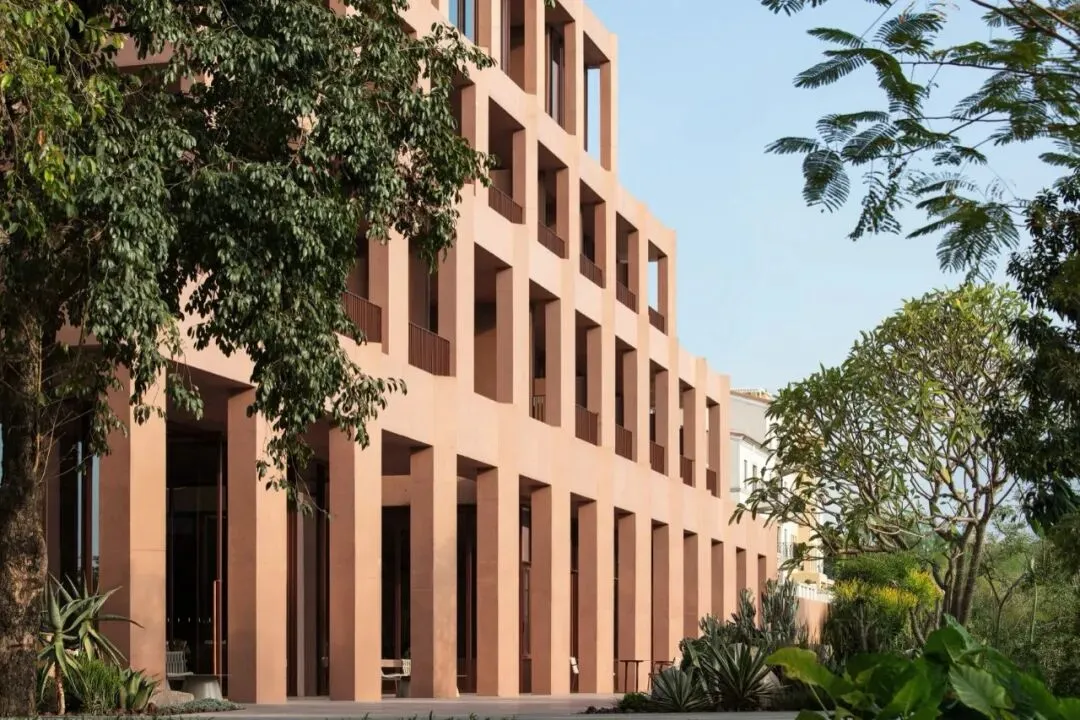 在材料方面我们选择使用红色清水混凝土来呈现建筑的主体结构,混凝土一次浇筑成型,将结构与材料最真实的呈现。低饱和度的红色像是老砖的颜色 ,也像是泥土的颜色,与混凝土天然、粗粝的质感结合,给人温暖的感觉。红色随着时间微妙的变换色调,让建筑有了表情和生命力,像是在和背后的群山一起生长。晴天时,红色的建筑与水中的倒影相呼映衬,更多了一分灵动。在与环境的对话之中,立面直线网格的坚实和厚感被柔化了,营造出轻盈的感知。与红色混凝土搭配使用的乱纹红铜板,运用在室外疏散楼梯、核心筒的外立面。金属的精致冷峻与混凝土的粗温润,在对比中加强了立面的层次感。整体材质明快的色调也让建筑从青山绿水之间跳脱出来,充满活力和愉悦的度假氛围。