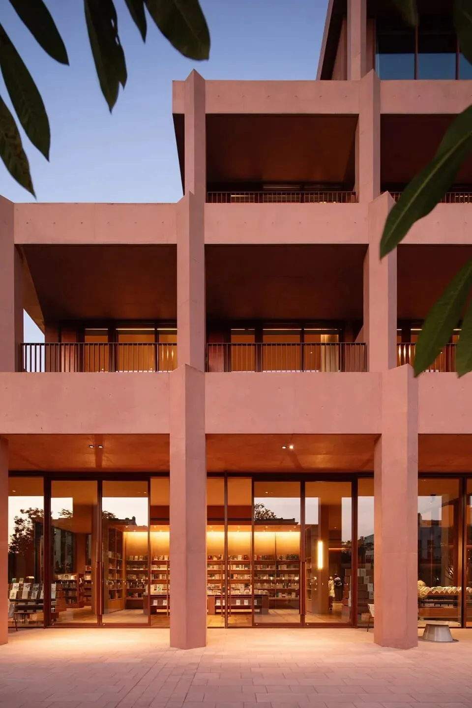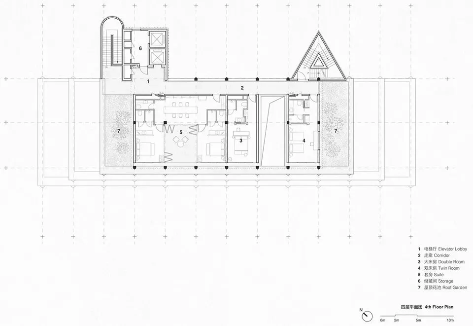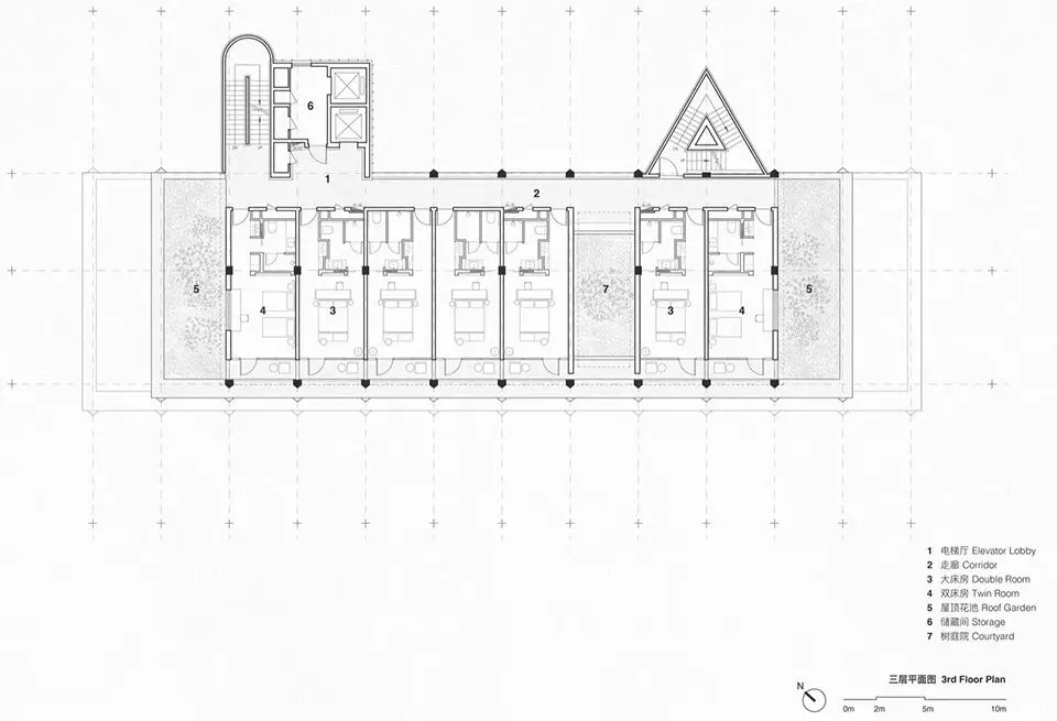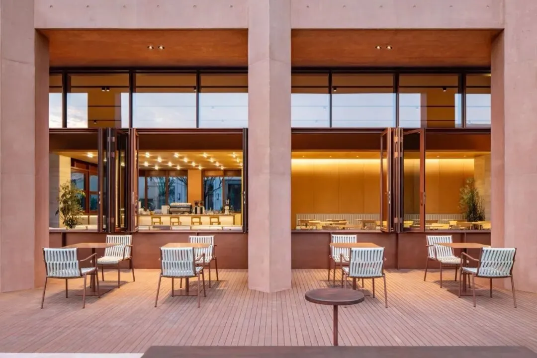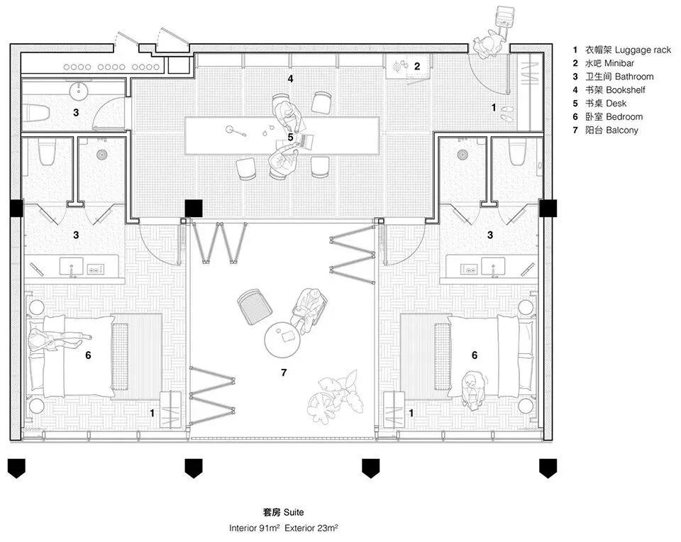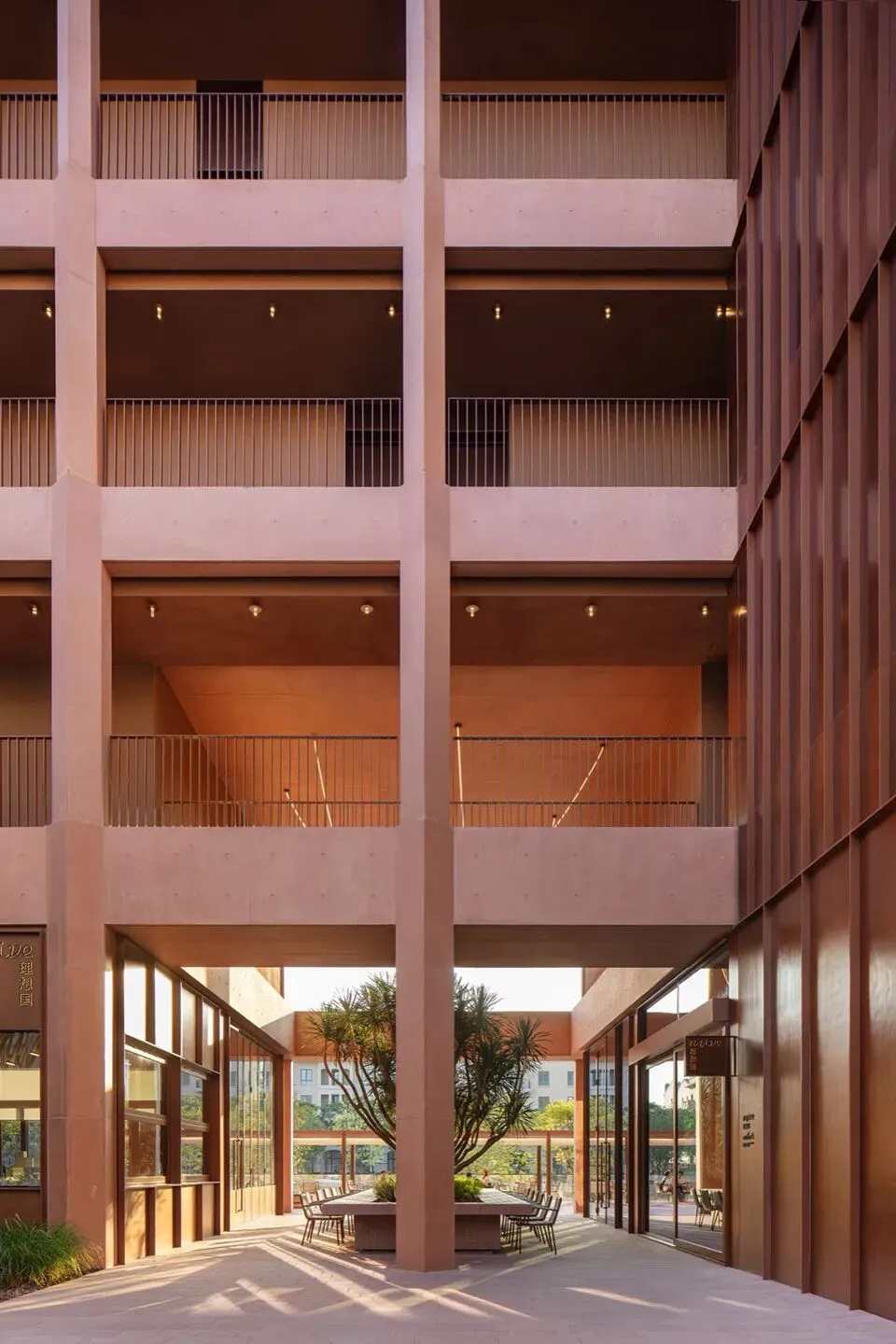 理想国酒店作为一个多功能集合式空间,也使用了“下铺上居“的空间构成逻辑。建筑共分为四层,首层是对外开放的书店、咖啡简餐厅, 二至四层为酒店客房。四层空间全部构建在“骑楼式”的连续柱廊之下。设计选择将外围结构体系的梁、板、柱直接暴露出来,立柱和梁板形成的直线网格既是视觉语法也是建筑实际的结构骨架。从外观来看,整个建筑的正面没有设实体墙,由多边形的立柱构建而成,外在造型直接体现着内在建造逻辑。柱廊形成的虚实空间,打开了想象。廊下的空间是一片灵动的场域, 它邀请阳光、微风入内,包容四季的流转,形成温柔的开放性边界。人们多样的生活场景也在其中展开——首层商业空间的沿街面全部后退留出公共人行空间,过往的游人漫步廊下,自然的就穿行进入了书店和咖啡厅内部;上方的楼层在柱间分隔出18间面向河景的客房,檐下的露台让客人与河景直接对话,亲近自然。功能性上,柱廊作为建筑的第二层表皮,遮阳避雨,顺应了广州多变的天气,同时也一定程度的遮挡了河对岸视线,让客房获得足够的隐私。建筑另一个突出的造型特点是退台式的设计。四层的建筑由四个堆叠的体块组成,随着楼层的增加,体积逐渐减小,形成富有力感的阶梯式造型。从各个角度看,它的轮廓都呈现出变化。作为地块中最靠近岸边的建筑,退台设计也一定程度的从视觉上消解了建筑体,形成更宜人的尺度感。在建筑稳定对称的结构之中,我们在首层和三层设计了两个挑高的半室外庭院,打破了立面复的韵律,形成空间的小变奏。同时引入阳光和绿植,让自然景观始终贯穿在建筑之间。位于首层中心的架空中庭,一侧正对河岸上的观景平台,另一面连接着步行街区,让建筑以开放的姿态接纳各个方向来往的行人,增强了建筑公共属性。庭院作为一个过渡空间,把书店和餐厅两个原本分离的功能区,通过人在其间的活动连接起来,让室内外的转换成为一种连续无形的空间体验。廊和院的设计让建筑有了“可以呼吸”的空间。在快节奏的现代生活中,城市空间总是在被高效的使用着,然而, 在单体建筑原本就有限的空间和范围里,我们仍然选择构建半室外连廊和架空庭院,把一定的空间贡献给自然和街道。设计上没有特意界定它们的功能,是人的活动赋予了空间意义——人的游走与自然的渗透在虚实之间悠然转换,空间也随着人和环境的变化而不断进化和生长。酒店的客人,或是社区里漫步而来的游客,在树庭院的长桌边坐下,发呆、读书、聊天、晒太阳。随着微风和光影变幻,人们的动作也自然的放缓下来,度过些许“散漫的时光”。设计相信,建筑的价值不在于宏大的叙事,而在于创造这样的微小的时刻,让人感知真实的生活和自我的存在。材料运用和室内设计Materials and Interior Design