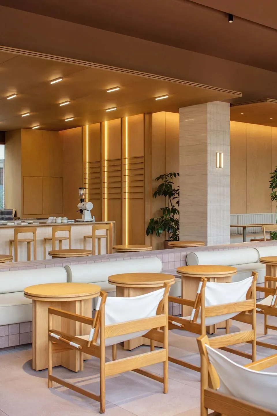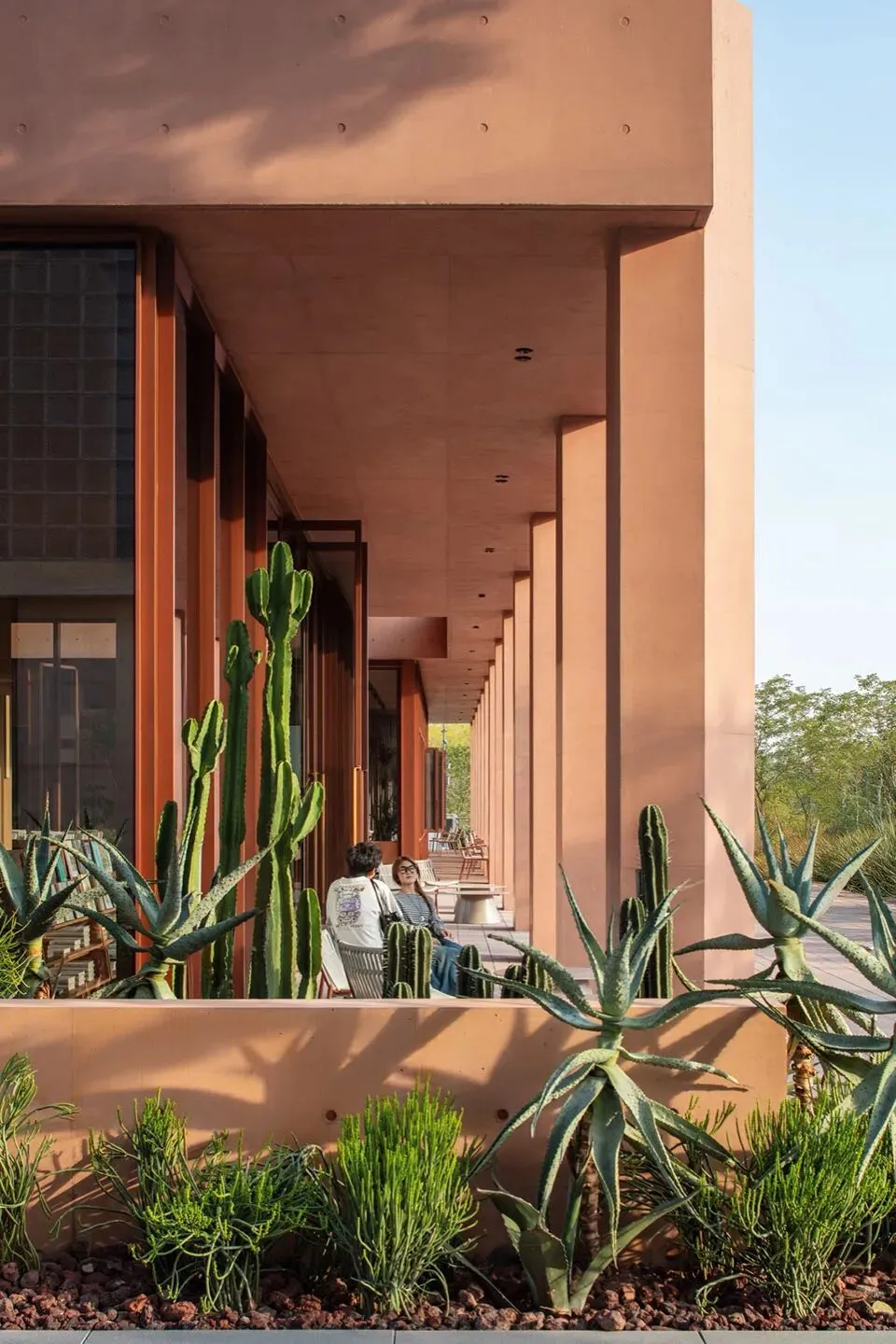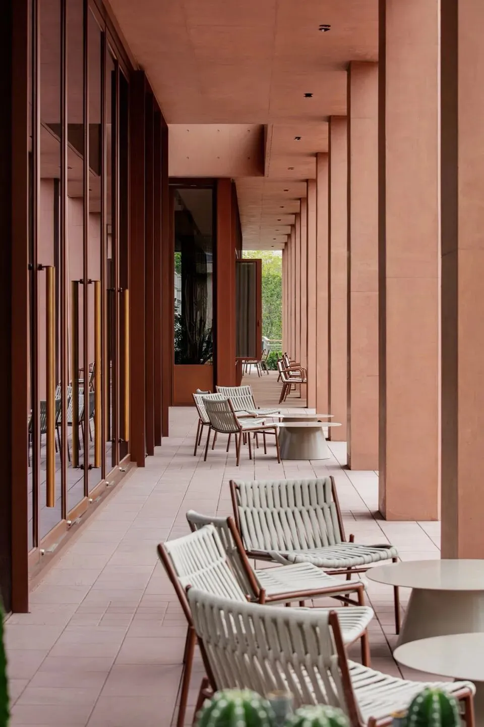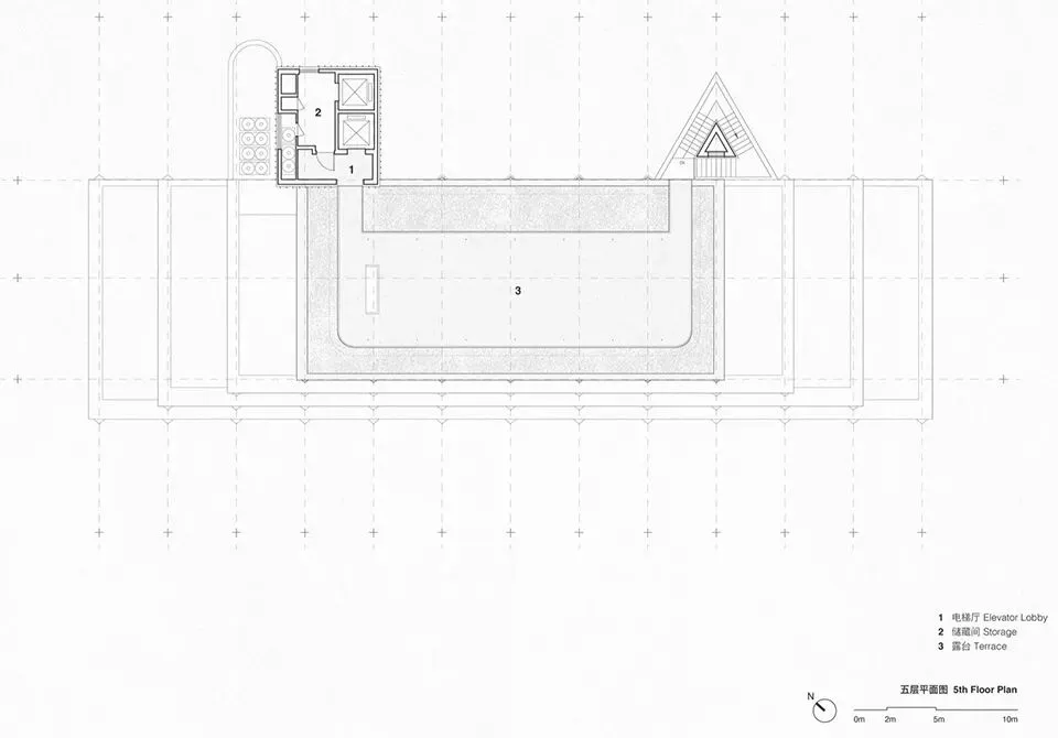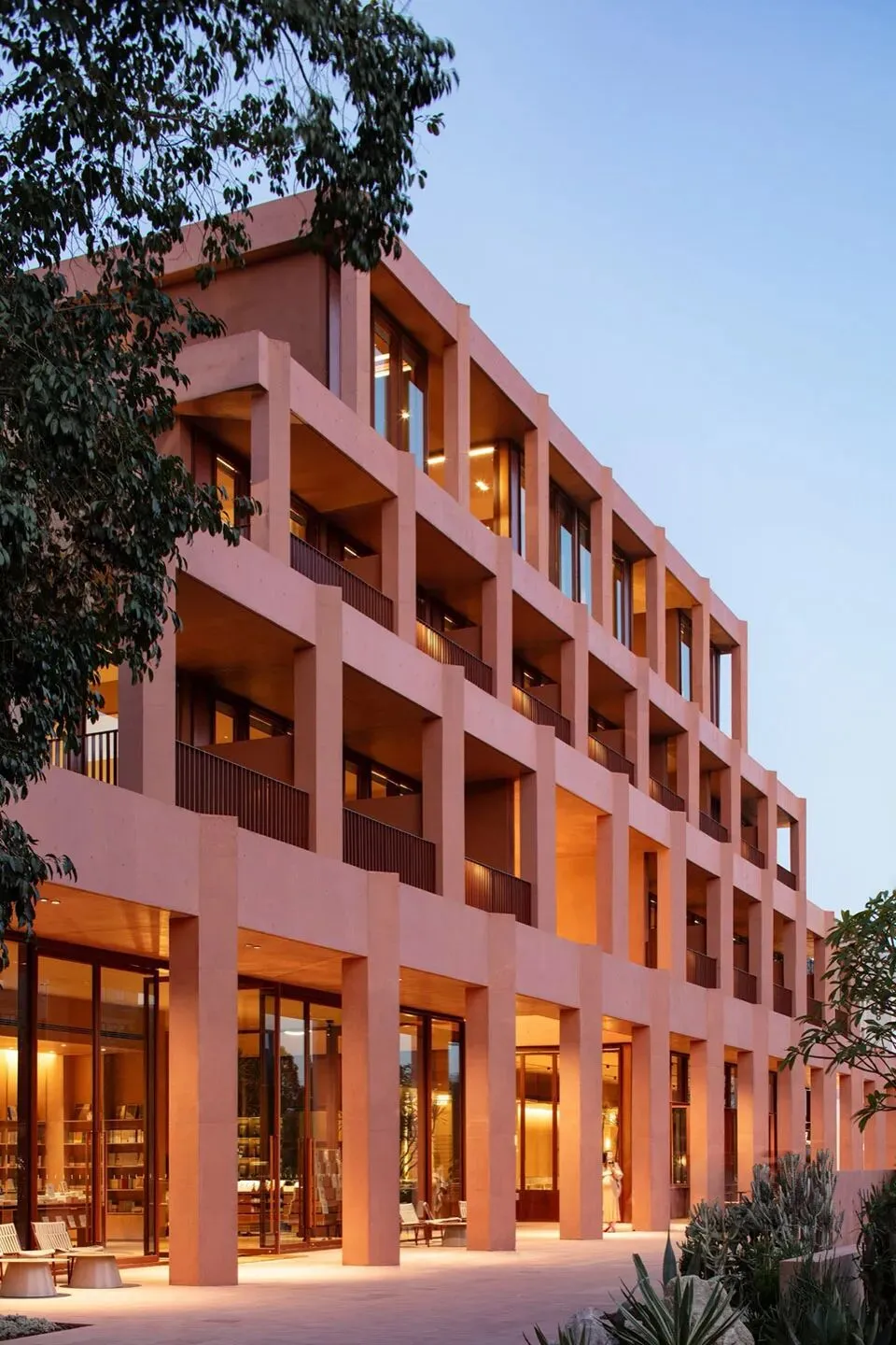 理想国酒店作为一个多功能集合式空间,也使用了“下铺上居“的空间构成逻辑。建筑共分为四层,首层是对外开放的书店、咖啡简餐厅, 二至四层为酒店客房。四层空间全部构建在“骑楼式”的连续柱廊之下。设计选择将外围结构体系的梁、板、柱直接暴露出来,立柱和梁板形成的直线网格既是视觉语法也是建筑实际的结构骨架。从外观来看,整个建筑的正面没有设实体墙,由多边形的立柱构建而成,外在造型直接体现着内在建造逻辑。柱廊形成的虚实空间,打开了想象。廊下的空间是一片灵动的场域, 它邀请阳光、微风入内,包容四季的流转,形成温柔的开放性边界。人们多样的生活场景也在其中展开——首层商业空间的沿街面全部后退留出公共人行空间,过往的游人漫步廊下,自然的就穿行进入了书店和咖啡厅内部;上方的楼层在柱间分隔出18间面向河景的客房,檐下的露台让客人与河景直接对话,亲近自然。功能性上,柱廊作为建筑的第二层表皮,遮阳避雨,顺应了广州多变的天气,同时也一定程度的遮挡了河对岸视线,让客房获得足够的隐私。建筑另一个突出的造型特点是退台式的设计。四层的建筑由四个堆叠的体块组成,随着楼层的增加,体积逐渐减小,形成富有力感的阶梯式造型。从各个角度看,它的轮廓都呈现出变化。作为地块中最靠近岸边的建筑,退台设计也一定程度的从视觉上消解了建筑体,形成更宜人的尺度感。在建筑稳定对称的结构之中,我们在首层和三层设计了两个挑高的半室外庭院,打破了立面复的韵律,形成空间的小变奏。同时引入阳光和绿植,让自然景观始终贯穿在建筑之间。位于首层中心的架空中庭,一侧正对河岸上的观景平台,另一面连接着步行街区,让建筑以开放的姿态接纳各个方向来往的行人,增强了建筑公共属性。庭院作为一个过渡空间,把书店和餐厅两个原本分离的功能区,通过人在其间的活动连接起来,让室内外的转换成为一种连续无形的空间体验。廊和院的设计让建筑有了“可以呼吸”的空间。在快节奏的现代生活中,城市空间总是在被高效的使用着,然而, 在单体建筑原本就有限的空间和范围里,我们仍然选择构建半室外连廊和架空庭院,把一定的空间贡献给自然和街道。设计上没有特意界定它们的功能,是人的活动赋予了空间意义——人的游走与自然的渗透在虚实之间悠然转换,空间也随着人和环境的变化而不断进化和生长。酒店的客人,或是社区里漫步而来的游客,在树庭院的长桌边坐下,发呆、读书、聊天、晒太阳。随着微风和光影变幻,人们的动作也自然的放缓下来,度过些许“散漫的时光”。设计相信,建筑的价值不在于宏大的叙事,而在于创造这样的微小的时刻,让人感知真实的生活和自我的存在。材料运用和室内设计Materials and Interior Design