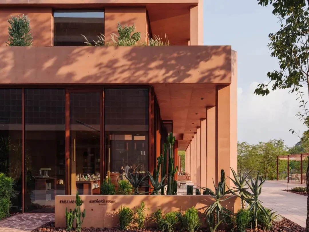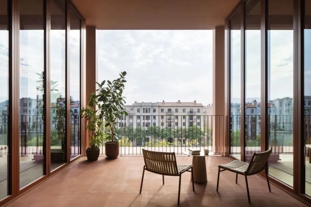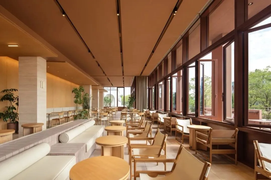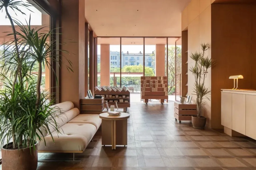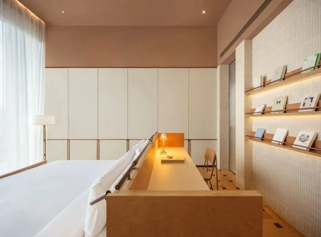 室内氛围也延续了建筑温暖的调性。首层分成两个通过中庭连接的独立室内区域,一侧空间集书店和酒店接待功能为一体,另一侧是简餐厅和咖啡厅。在公区设计中,我们没有设置隔墙将不同的功能硬性隔开,而是创造一个连续流动的动线,最大程度释放建筑空间本身开放的特质。二到四层的客房共18间,分为3种户型。 标准户型虽然室内面积不算大,但每个房间都有一个充满阳光的河景阳台,把生活放大和延伸。室内大使用了木纹石材、红色洞石、红色海洋板、混凝土砖、等暖色的材料, 天然材质温润的属性和带有暖意的色彩,让空间保持着亲和感和烟火气息。在局部的地面和墙面,我们设计了拼花木地板、拼花水磨石和马赛克石材砖,多种纹样的使用让人联想到广州的老式花砖,把广府的技艺和美学传统用现代的语言融入到空间细节之中。总结New Way of Thinking