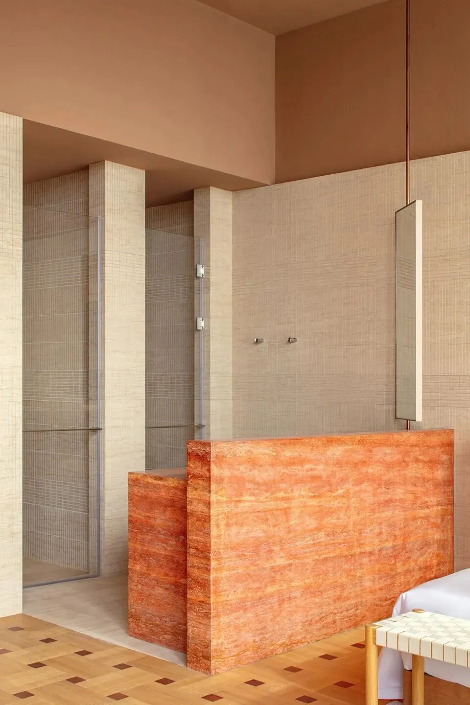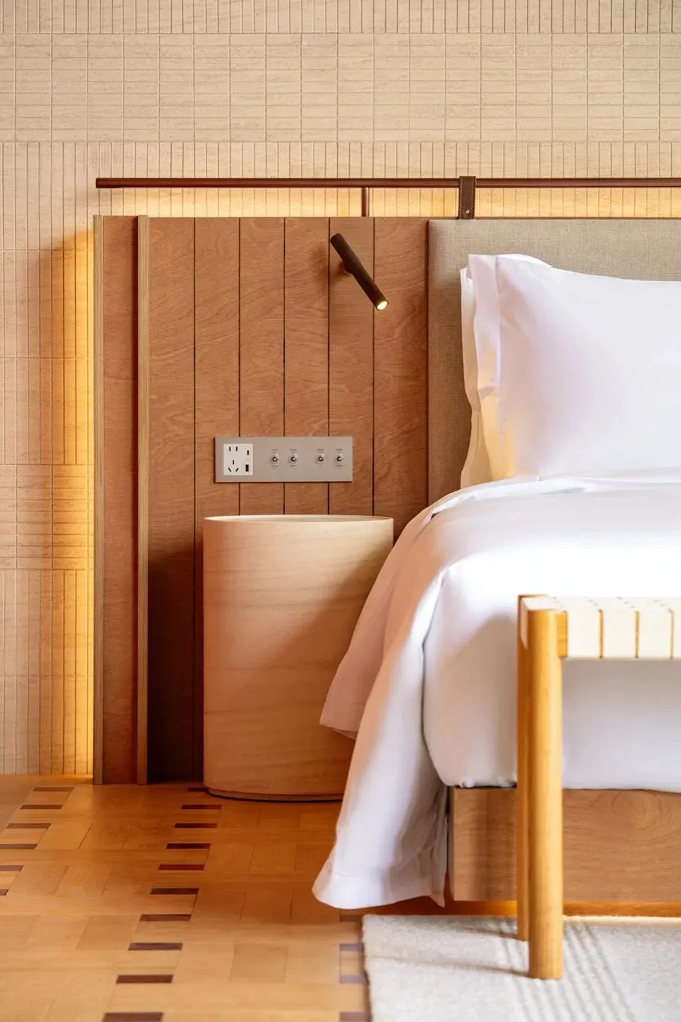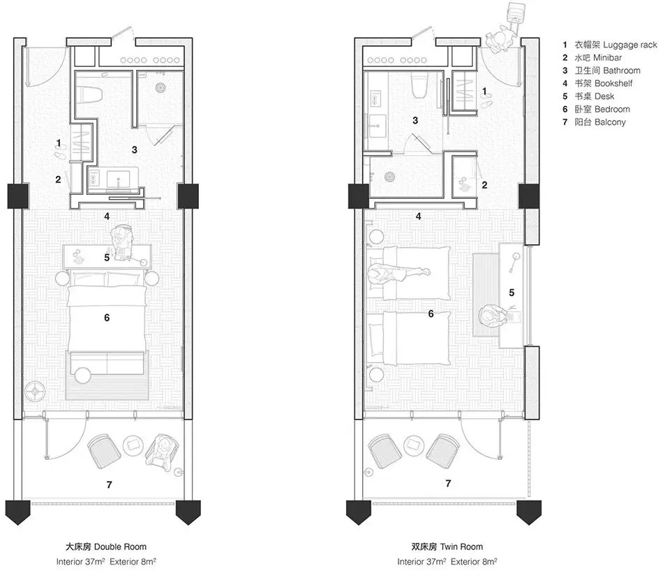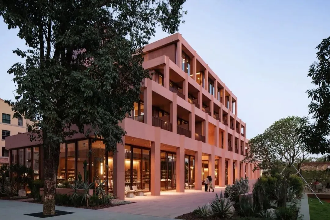 室内氛围也延续了建筑温暖的调性。首层分成两个通过中庭连接的独立室内区域,一侧空间集书店和酒店接待功能为一体,另一侧是简餐厅和咖啡厅。在公区设计中,我们没有设置隔墙将不同的功能硬性隔开,而是创造一个连续流动的动线,最大程度释放建筑空间本身开放的特质。二到四层的客房共18间,分为3种户型。 标准户型虽然室内面积不算大,但每个房间都有一个充满阳光的河景阳台,把生活放大和延伸。室内大使用了木纹石材、红色洞石、红色海洋板、混凝土砖、等暖色的材料, 天然材质温润的属性和带有暖意的色彩,让空间保持着亲和感和烟火气息。在局部的地面和墙面,我们设计了拼花木地板、拼花水磨石和马赛克石材砖,多种纹样的使用让人联想到广州的老式花砖,把广府的技艺和美学传统用现代的语言融入到空间细节之中。总结New Way of Thinking
