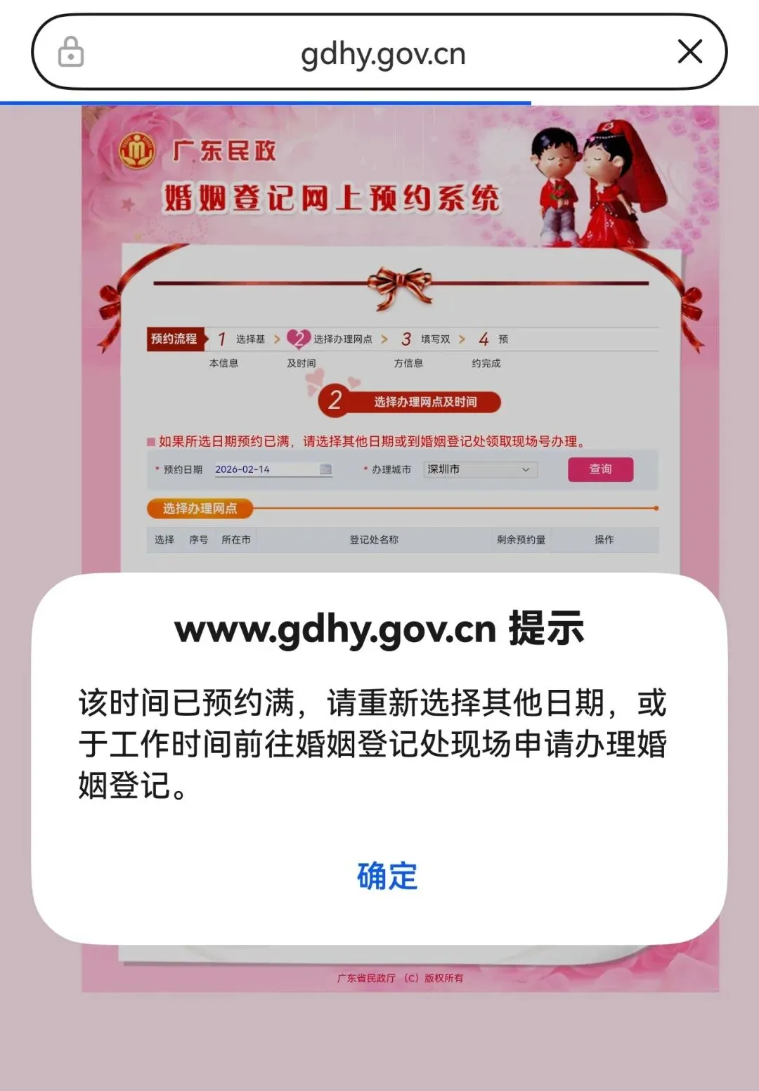 截至目前,经查询预约系统发现,2月14日当天,深圳各区婚姻登记处线上名额已全部约满。前一天2月13日的名额还有不少。