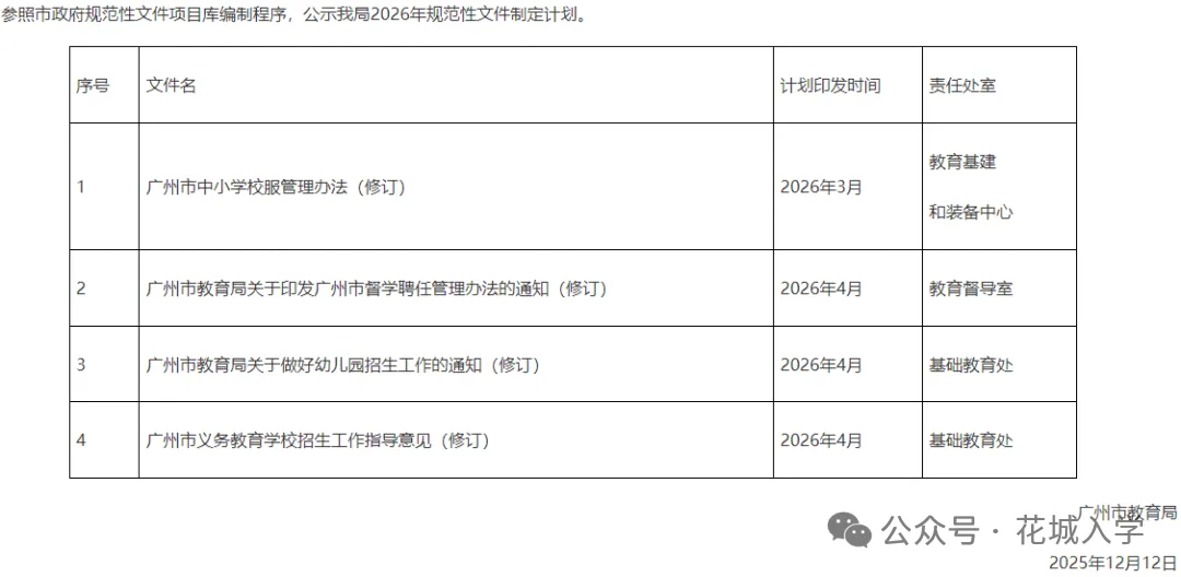 广州市教育局公示的规范化文件制定计划可知,将于2026年3月发布《广州市中小学校服管理办法(修订)》;