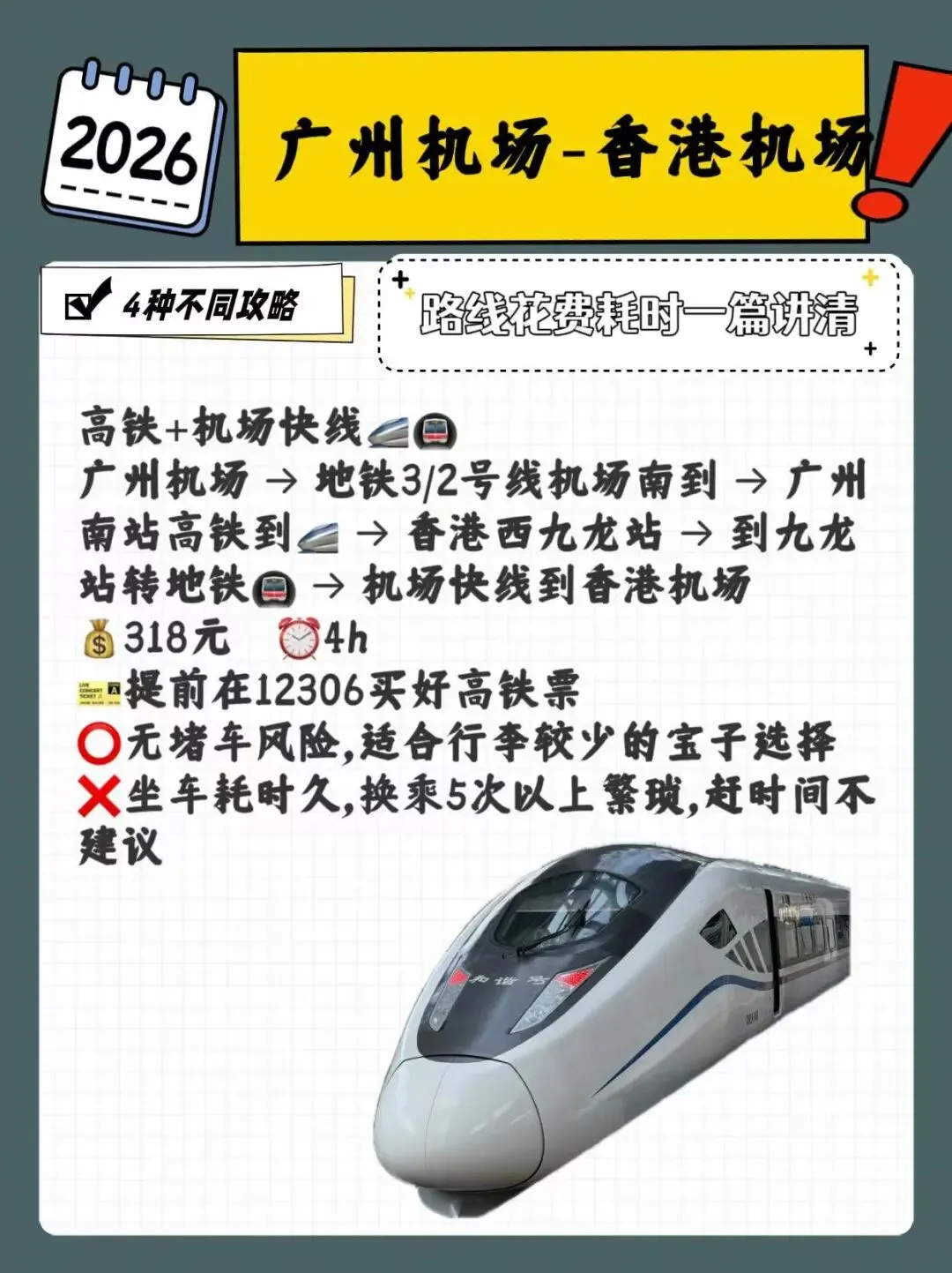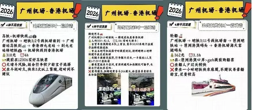 广州机场 → 地铁3/2号线机场南到 → 广州南站高铁到🚄 → 香港西九龙站 → 到九龙站转地铁🚇 → 机场快线到香港机场