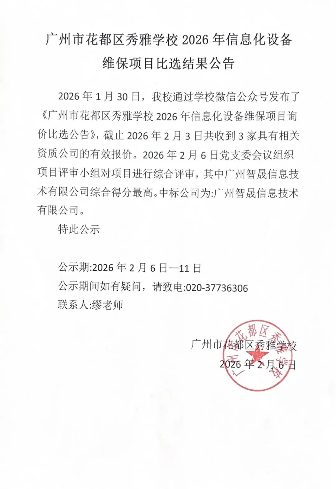 广州市花都区秀雅学校2026年信息化设备维保项目比选结果公告
