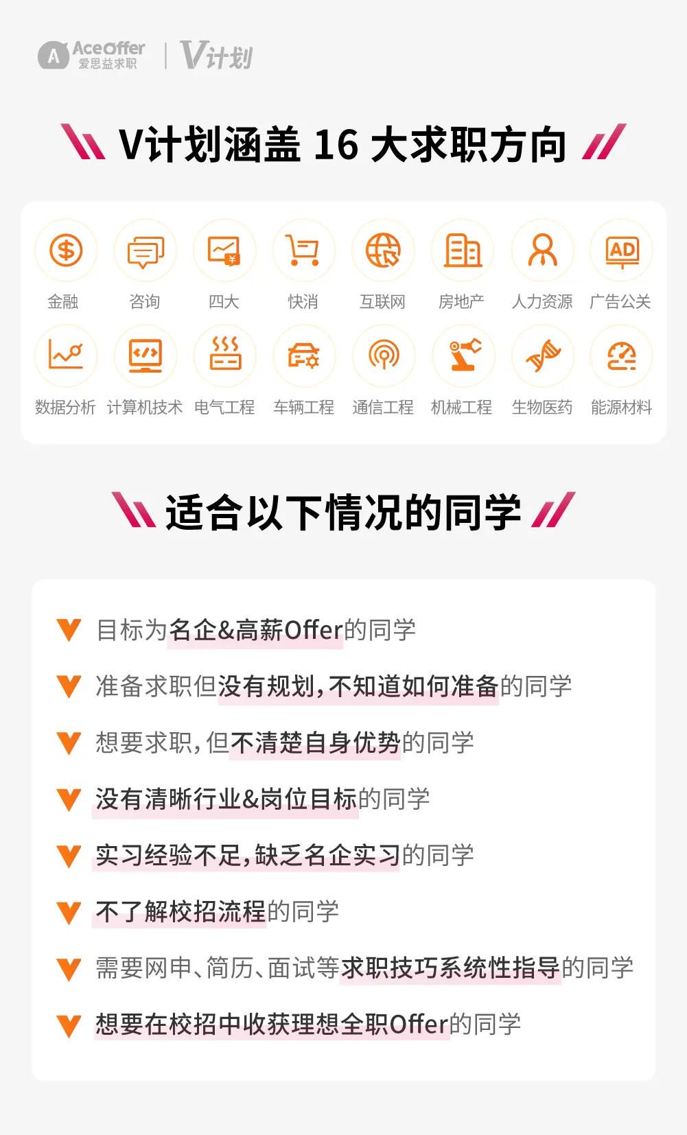 爱思益【V计划】将从简历修改、网申、笔面试到Offer选择,辅导你的求职问题,直至助你拿下心仪Offer!