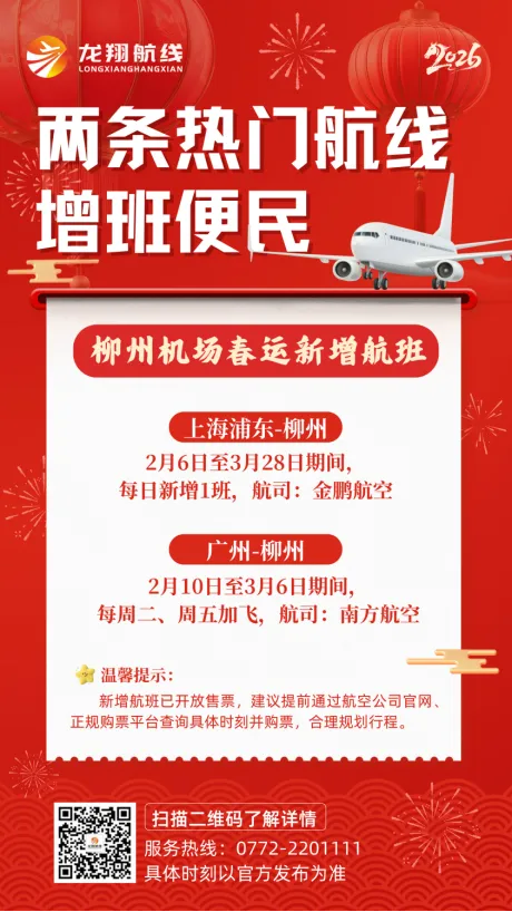 春节回家、出游更方便!柳州机场春运航班优化升级,两条热门航线增加班次,助力大家轻松出行,快来看看具体的增班详情吧!