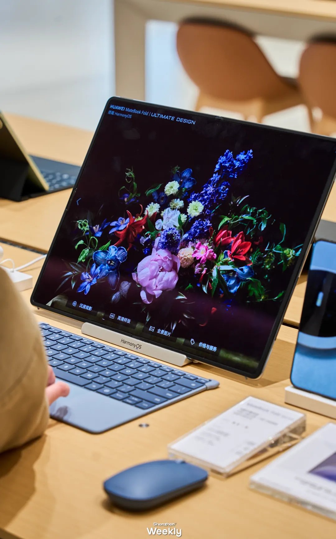 拾级而上至二层,便是华为3C体验区。这里汇聚华为全场景现款3C产品,手机、平板、穿戴设备、智慧屏等产品都可以自由上手,可以感受更贴近日常智慧生活。