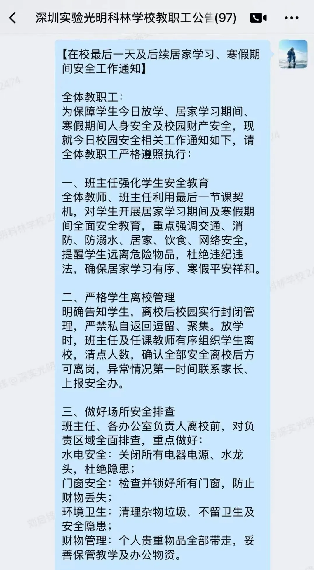 2026年1月23日,学校发布在校最后一天、居家学习及寒假安全通知。要求班主任强化学生安全教育,严格落实离校人数清点工作;同时,组织教职工排查责任区域水电、门窗安全,清理杂物,切实确保校园与学生假期平安。